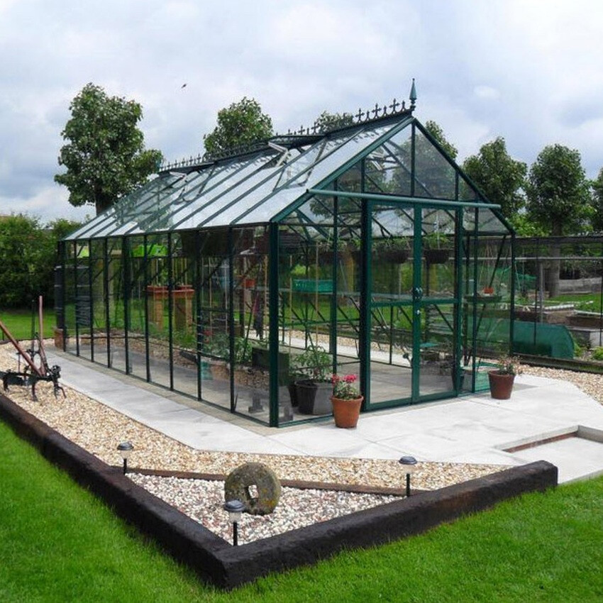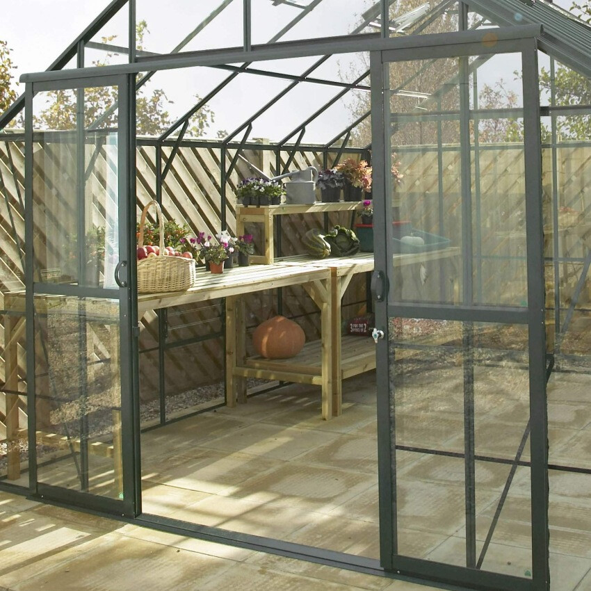 Die Gewächshäuser von Hercules bieten serienmäßig schon alles, was das Gärtnerherz begehrt. Dieses Modell ist aus einer besonders stabilen Aluminiumkonstruktion gefertigtund wird standardmäßig in der Farbe Grüngrau geliefert. Ein Gewächshaus aus Glas der Marke Hercules ist damit nicht nur äußerst solide, sondern auch ein Blickfang im Garten.