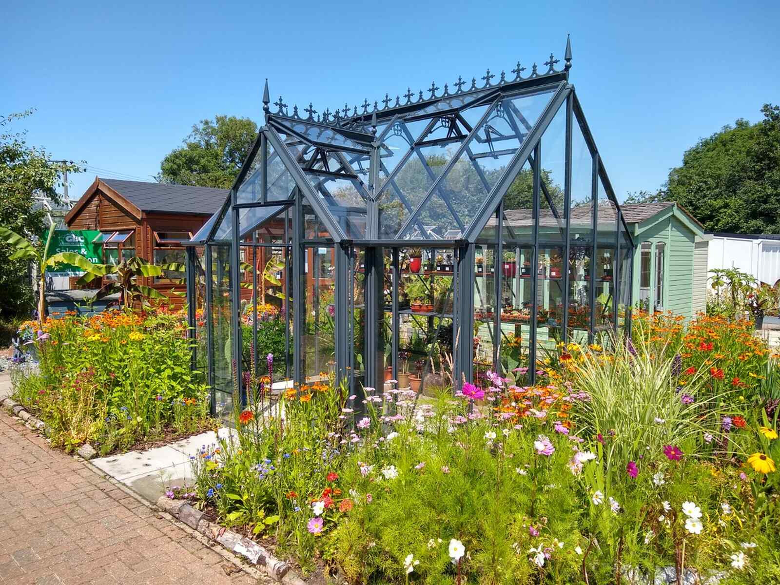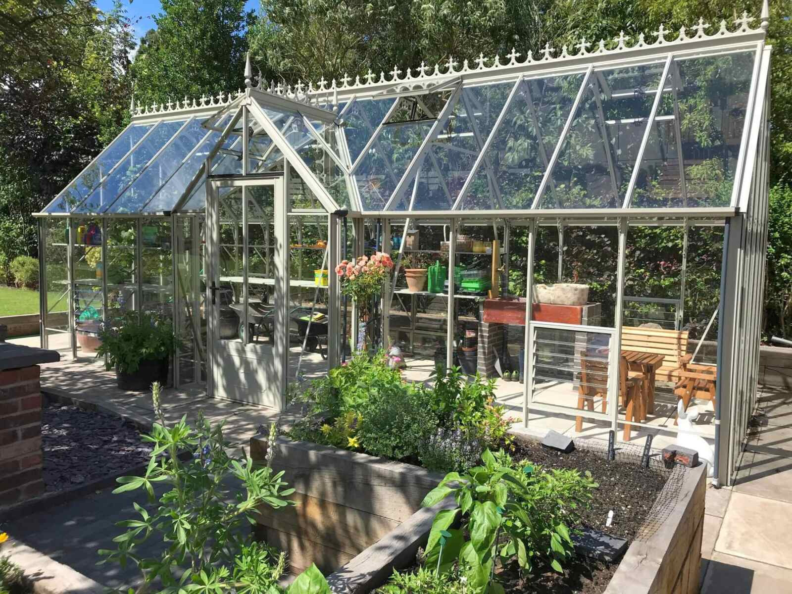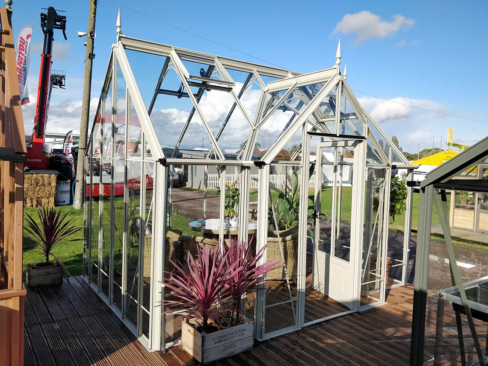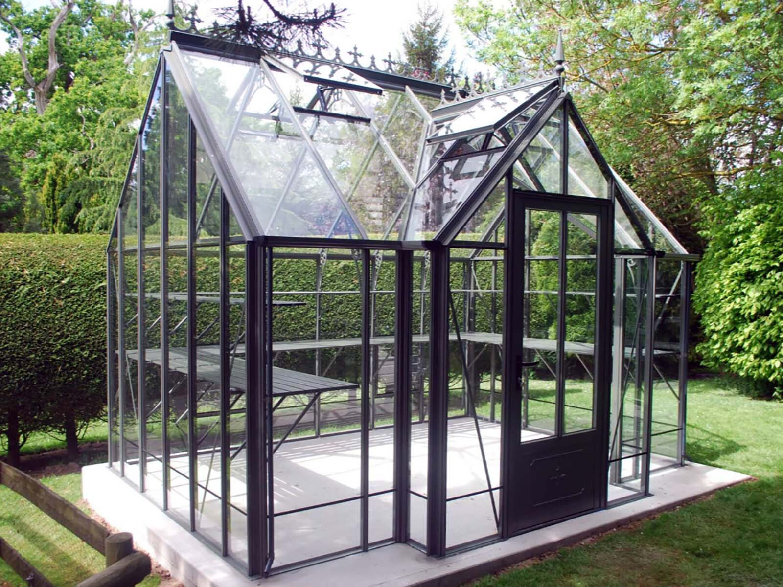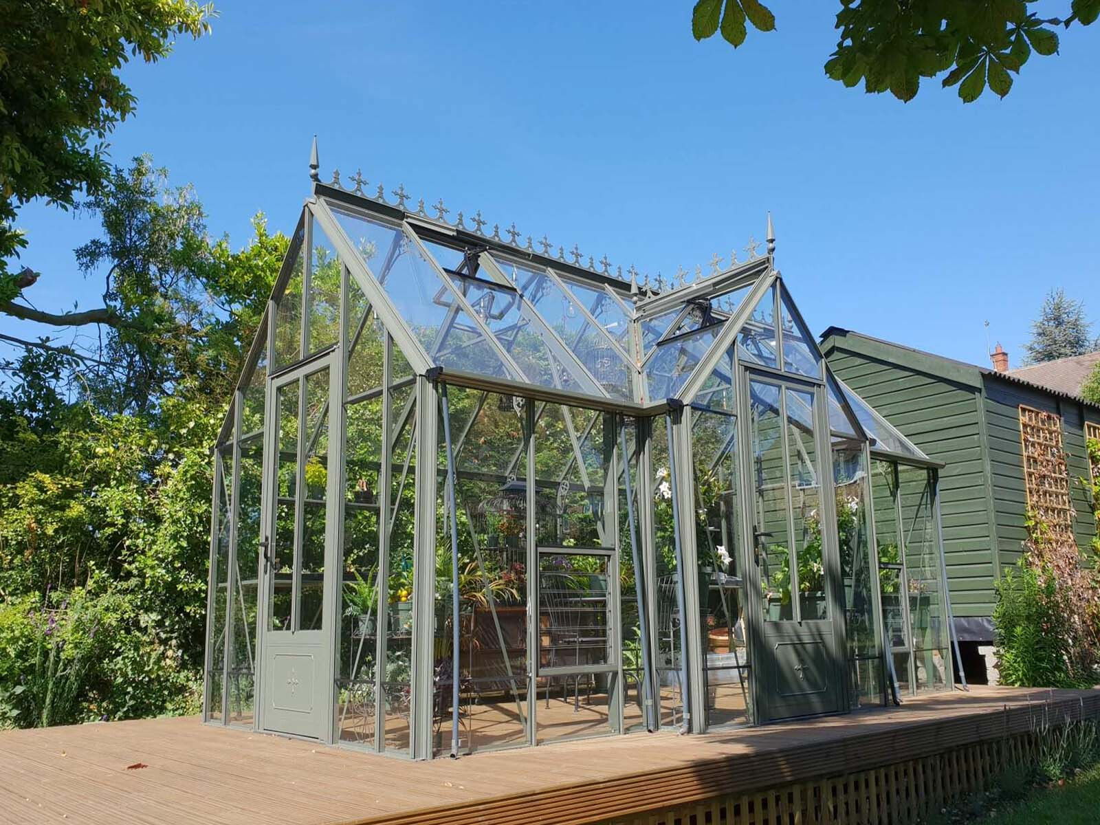 Die enorme Firsthöhe und die 45 Grad-Dachneigung sind typisch für den viktorianischen Stil. Das Robinsons Victorian mit Kapelleneingang ist in zwei Varianten verfügbar: mit Glas bis zum Boden oder in der sogenannten Dwarf Wall-Ausführung, geignet für einen 52 cm hohen Backsteinsockel.