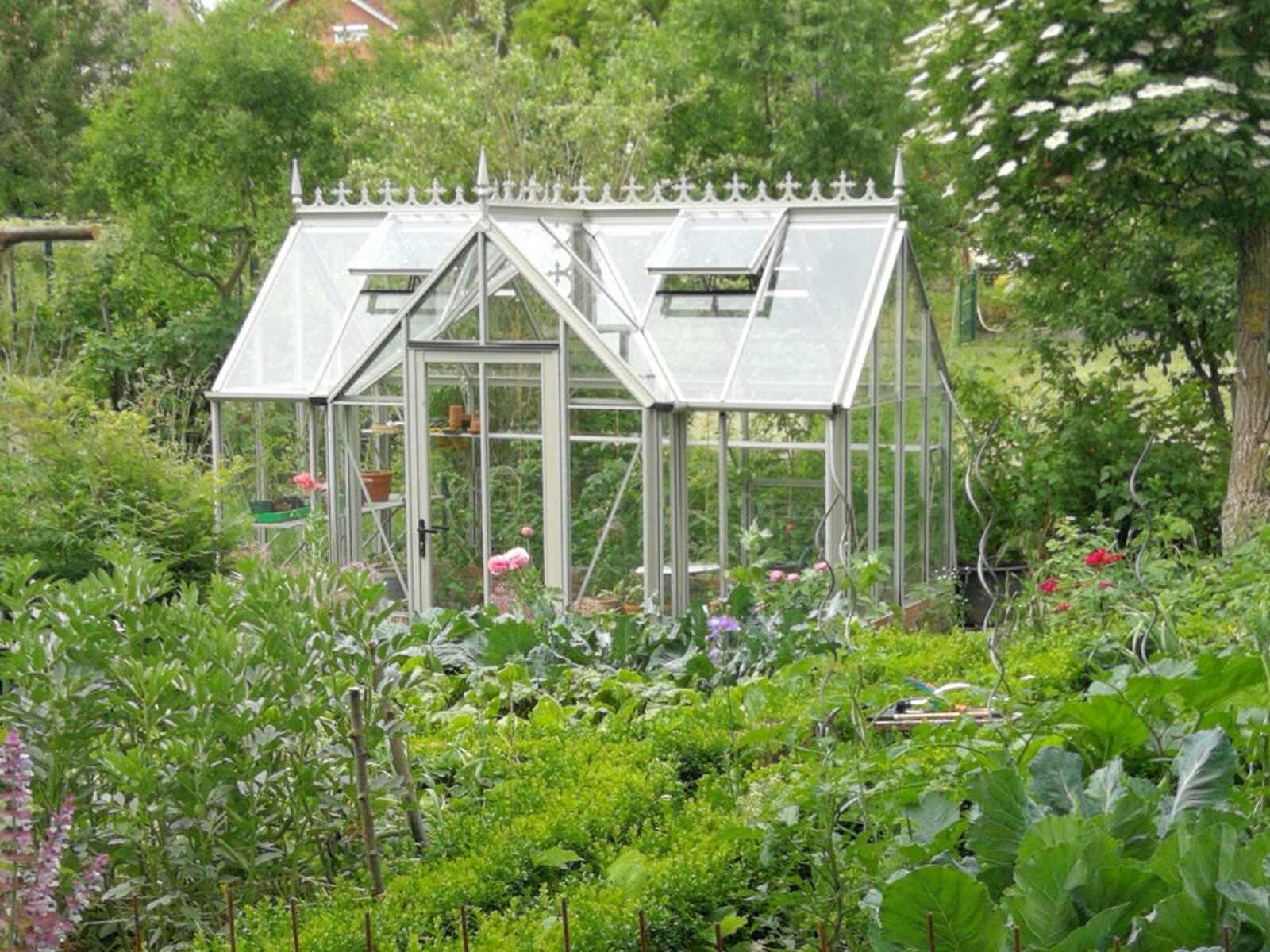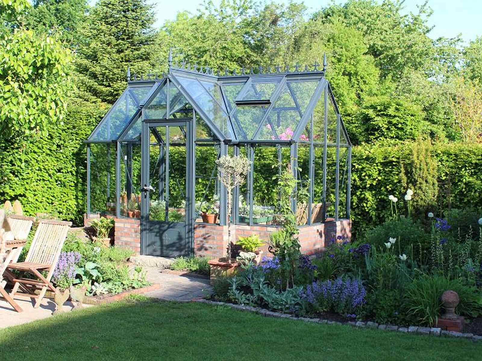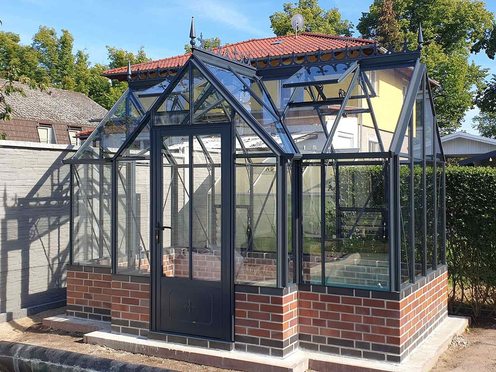 Die enorme Firsthöhe und die 45 Grad-Dachneigung sind typisch für den viktorianischen Stil. Das Robinsons Victorian mit Kapelleneingang ist in zwei Varianten verfügbar: mit Glas bis zum Boden oder in der sogenannten Dwarf Wall-Ausführung, geeignet für einen 52 cm hohen Backsteinsockel.