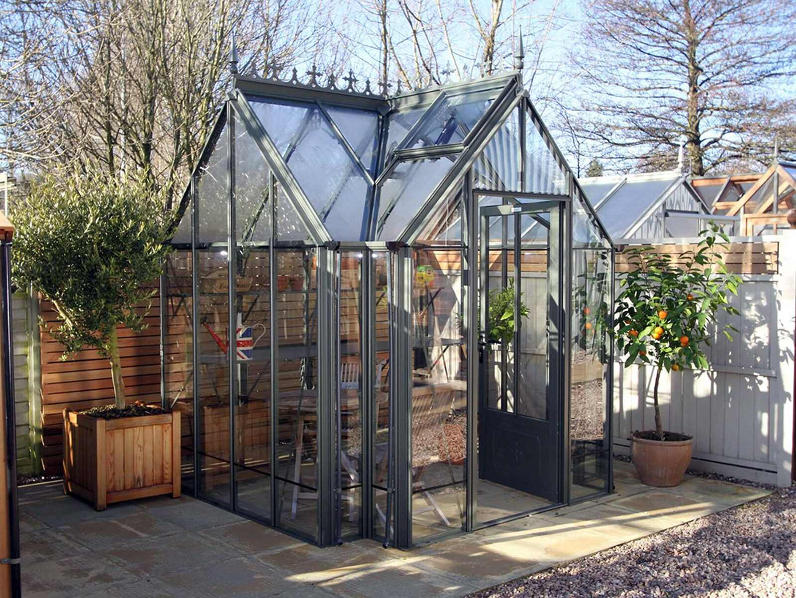 Die enorme Firsthöhe und die 45 Grad-Dachneigung sind typisch für den viktorianischen Stil. Das Robinsons Victorian mit Kapelleneingang ist in zwei Varianten verfügbar: mit Glas bis zum Boden oder in der sogenannten Dwarf Wall-Ausführung, geeignet für einen 52 cm hohen Backsteinsockel.