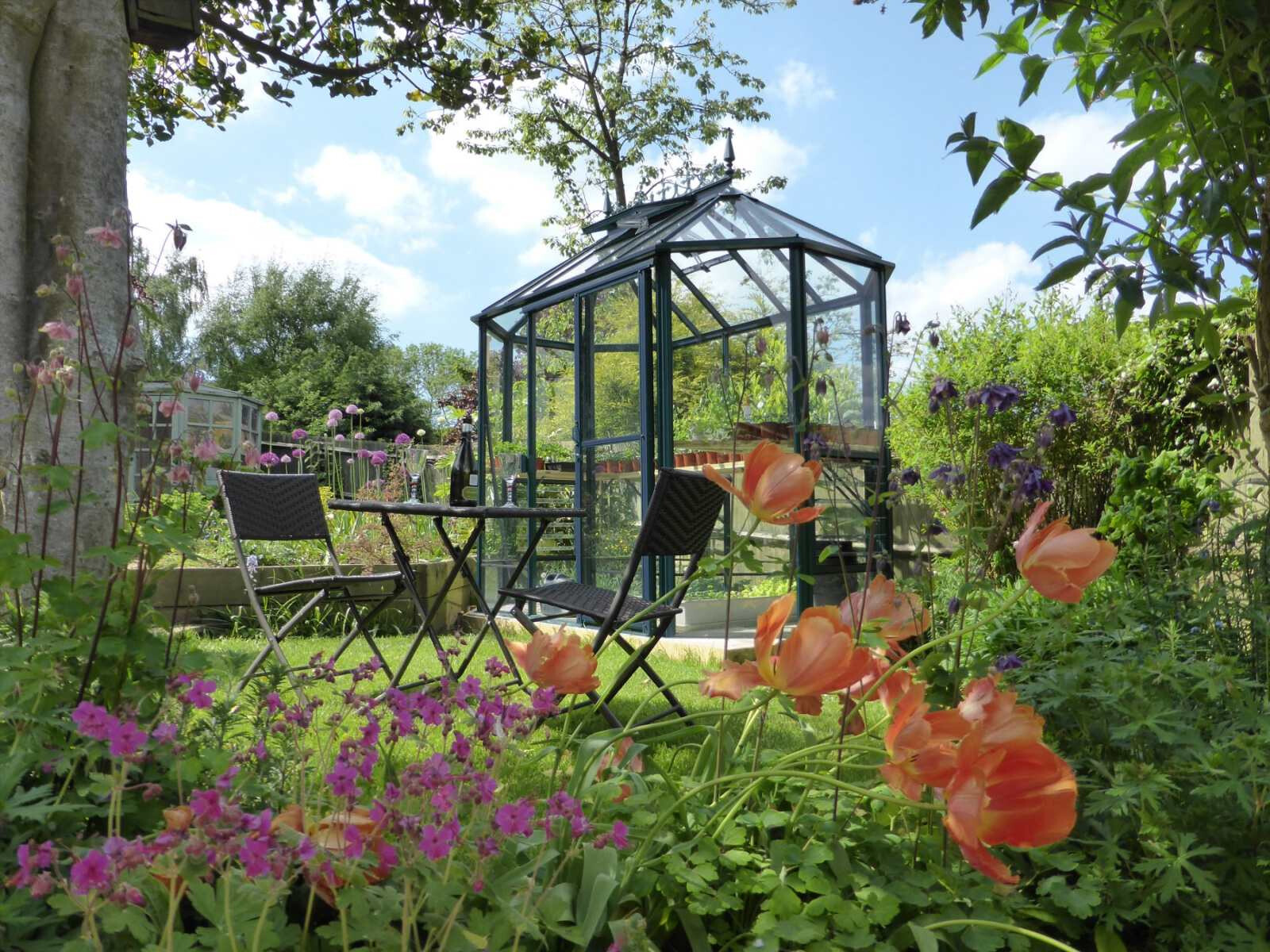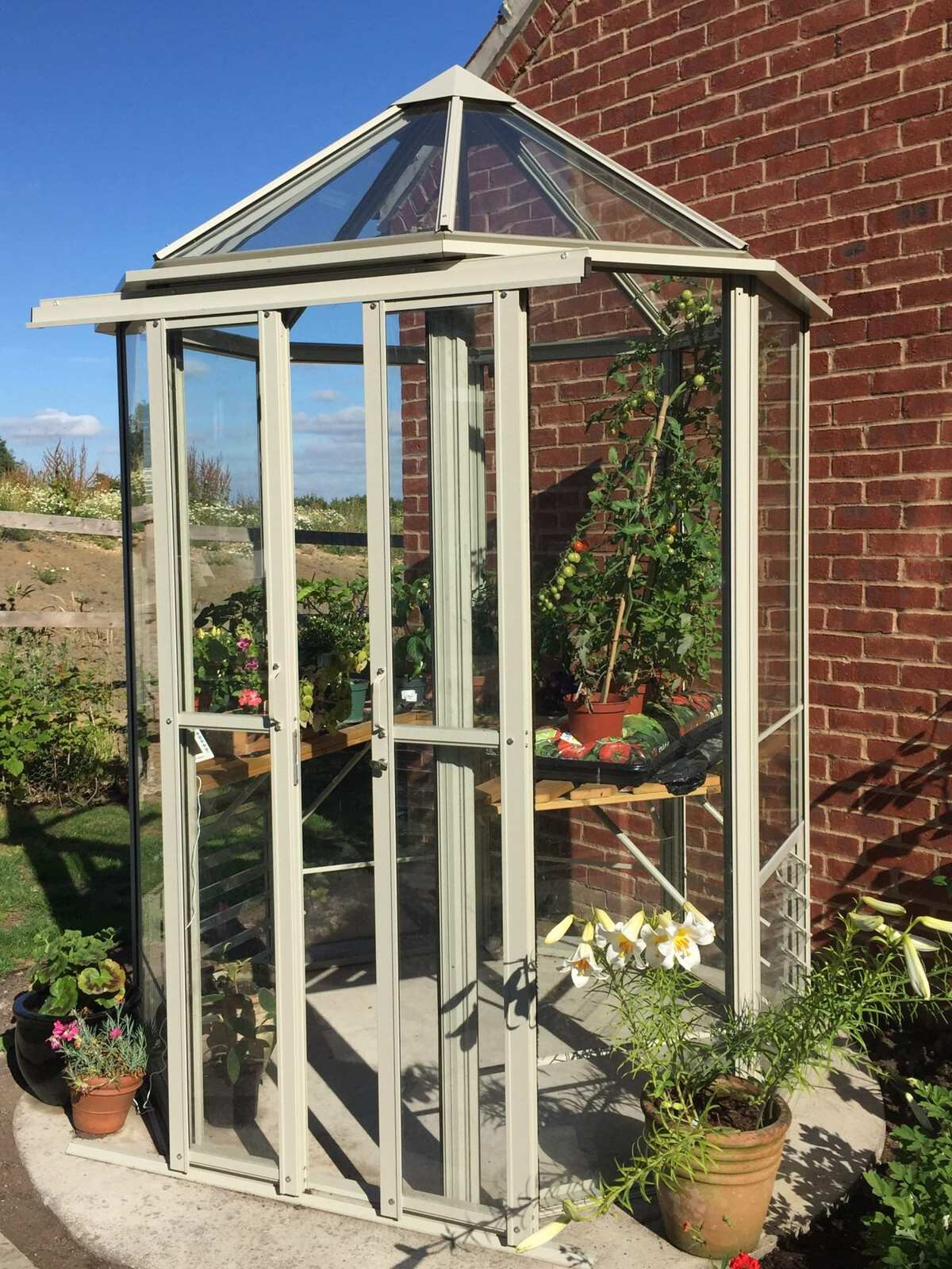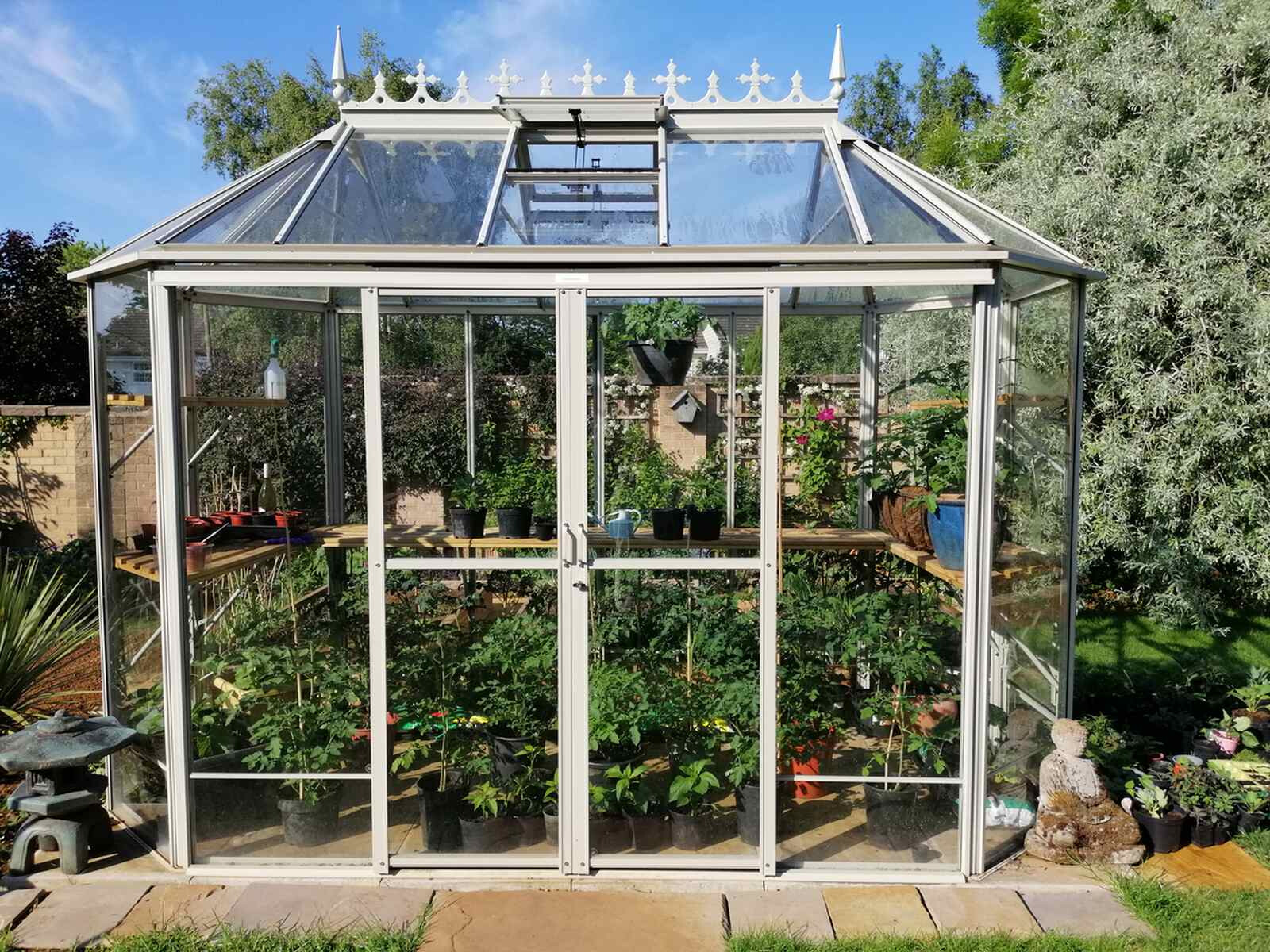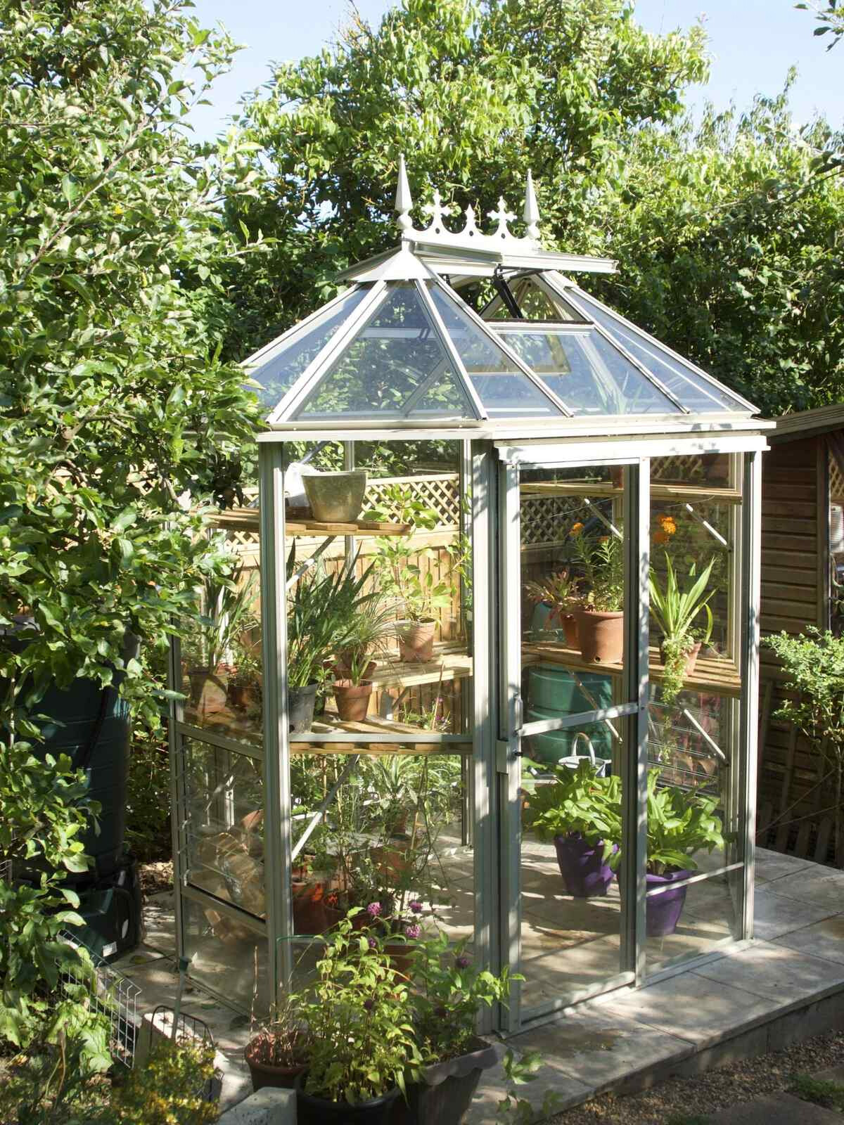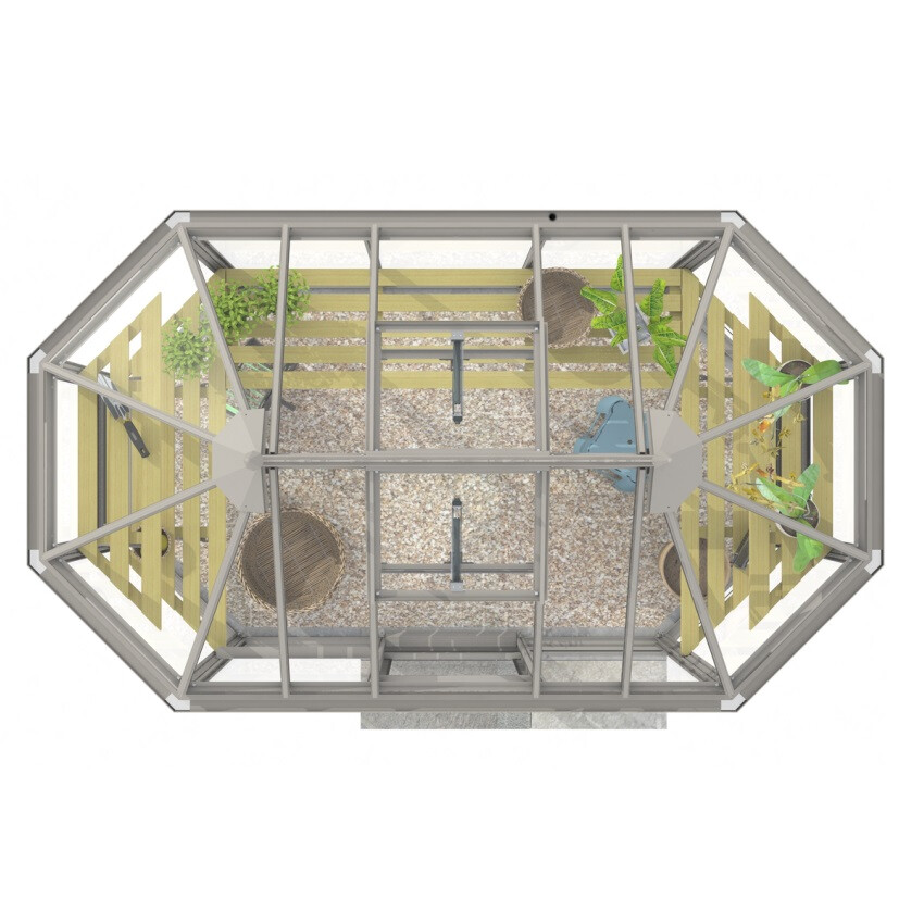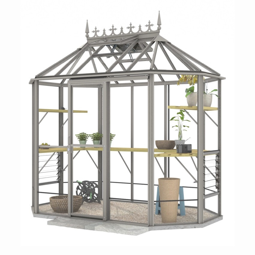 Ein sehr elegantes und geräumiges Gewächshaus, vor allem in der Höhe! Das Gewächshaus Renaissance ist in seiner kleinsten Ausführung ein so genanntes 'Oktogon' mit einem Querschnitt von 171 cm. Je nach Modell ausgeführt mit einer 60 oder 120 cm breiten verschließbaren Doppelschiebetür. Dieses Gewächshaus braucht nur relativ wenig Platz, aber mit einer Traufhöhe von 195 cm ist es natürlich phänomenal geräumig.