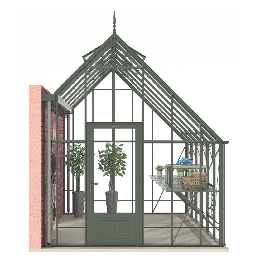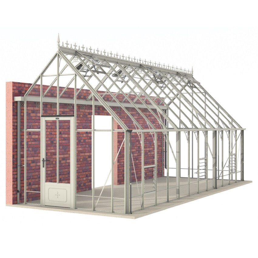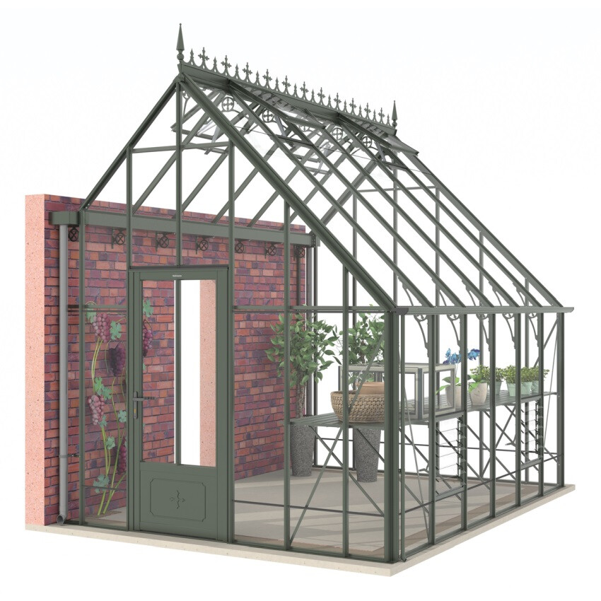 Die enorme Firsthöhe und die 45 Grad-Dachneigung sind typisch für den viktorianischen Stil. Dieses Modell ist in zwei Varianten verfügbar: mit Glas bis zum Boden oder in der sogenannten Dwarf Wall-Ausführung, geeignet für einen 52 cm hohen Backsteinsockel.