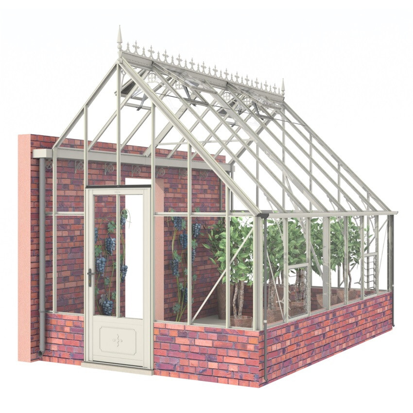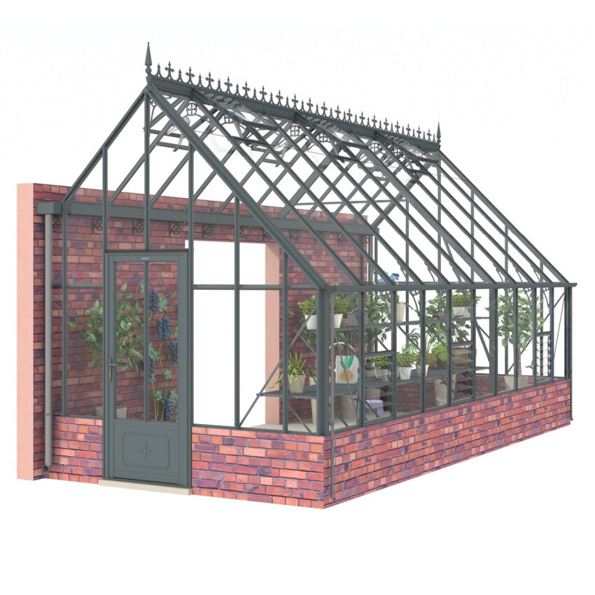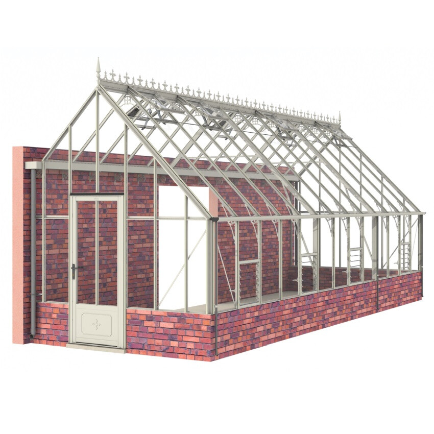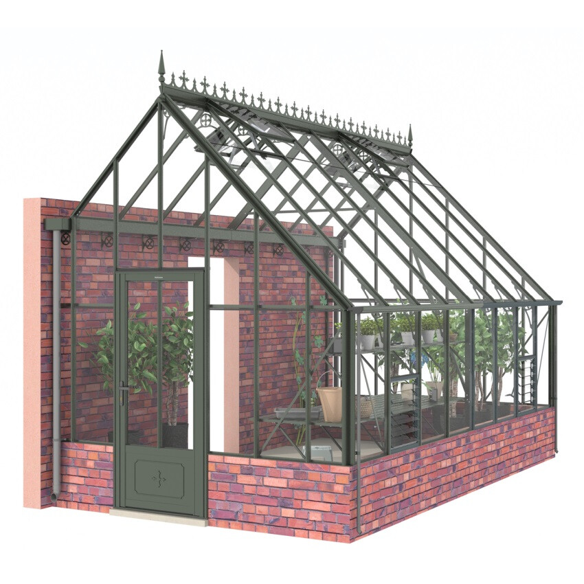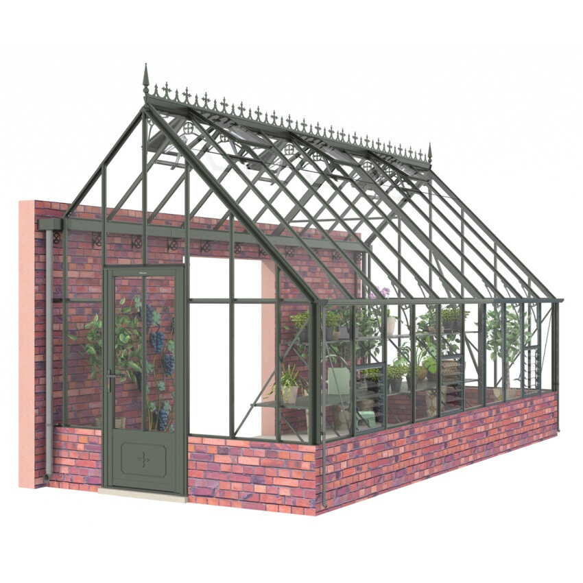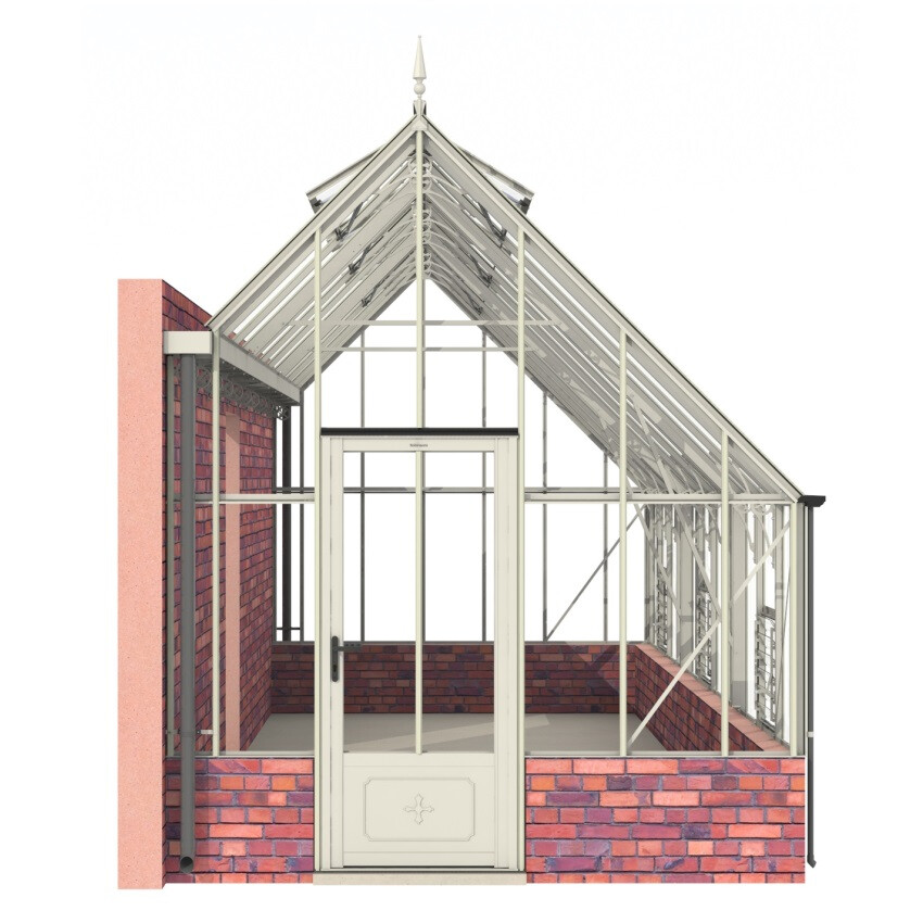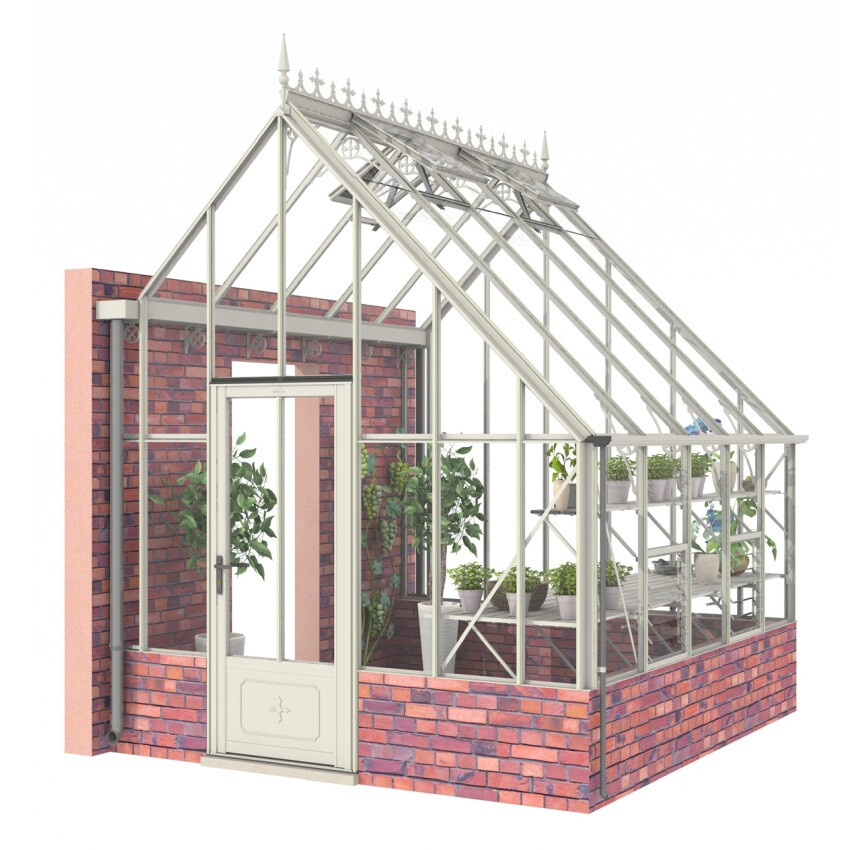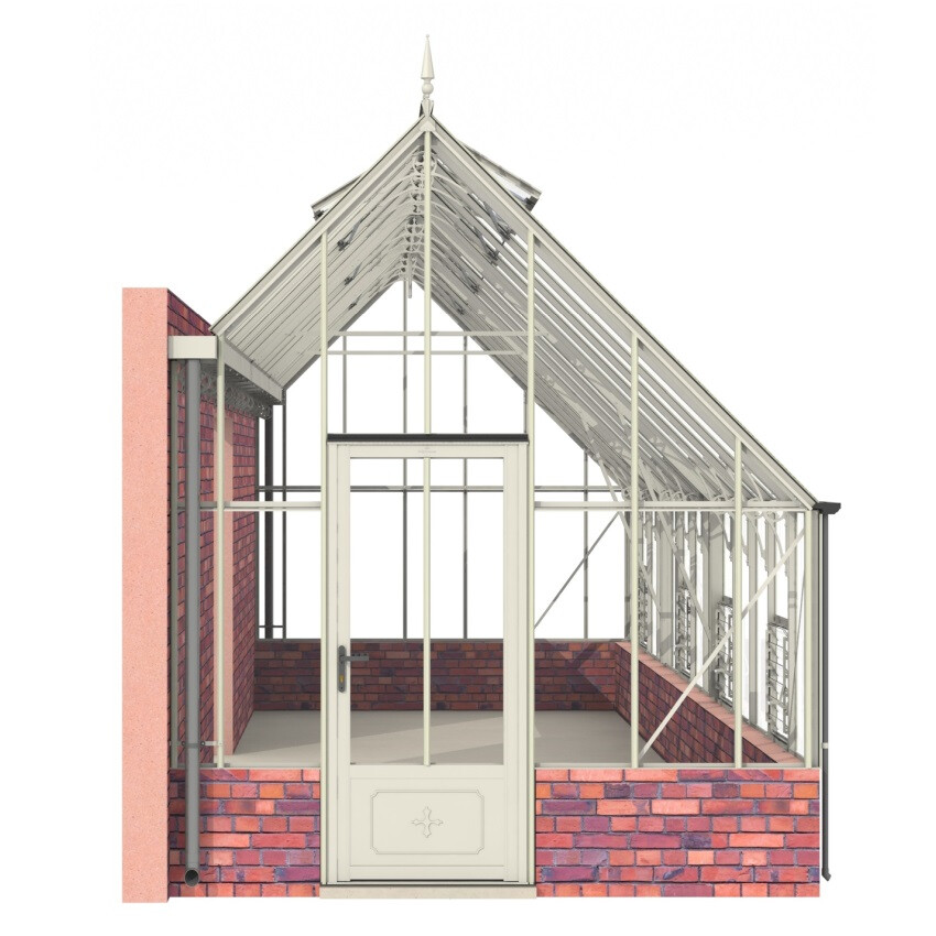 Die enorme Firsthöhe und die 45 Grad-Dachneigung sind typisch für den viktorianischen Stil. Dieses Modell ist in zwei Varianten verfügbar: mit Glas bis zum Boden oder in der sogenannten Dwarf Wall-Ausführung, geeignet für einen 52 cm hohen Backsteinsockel.
