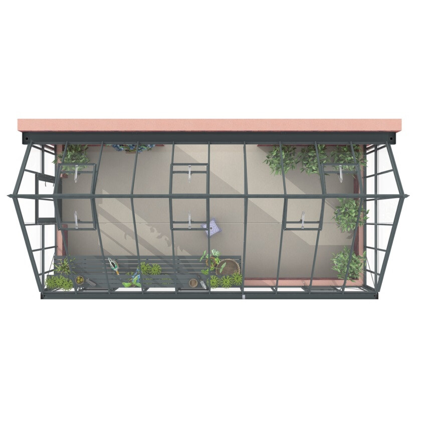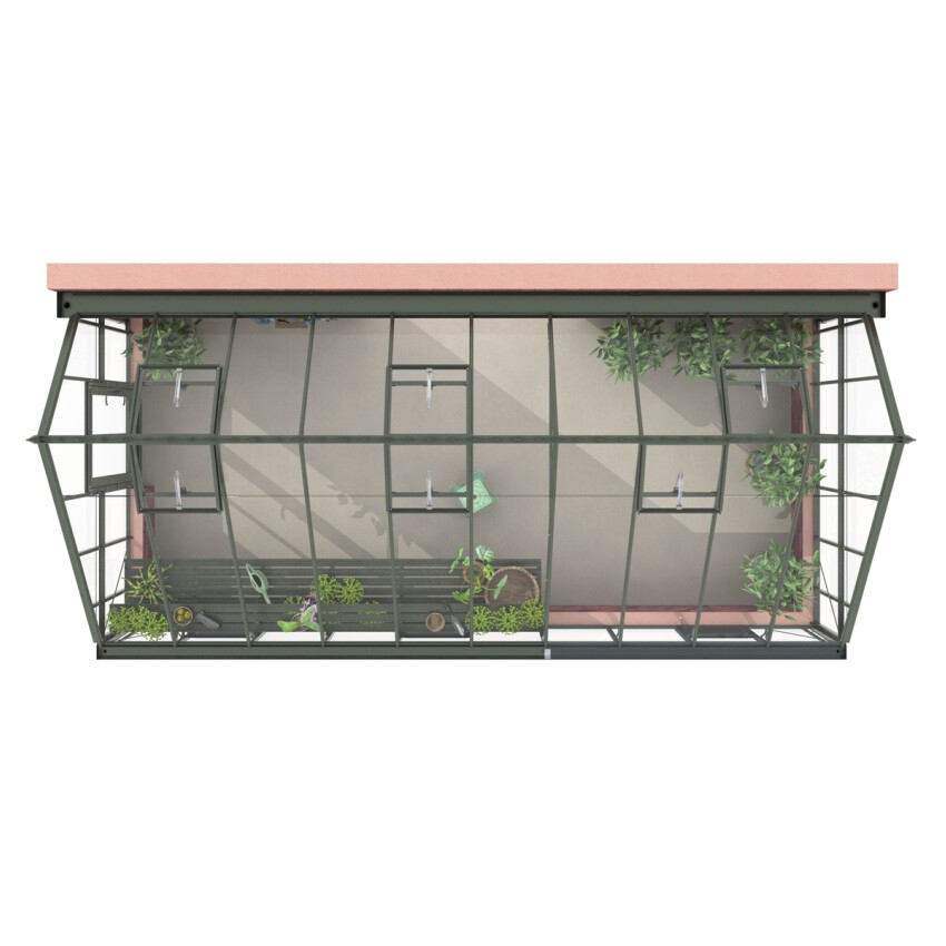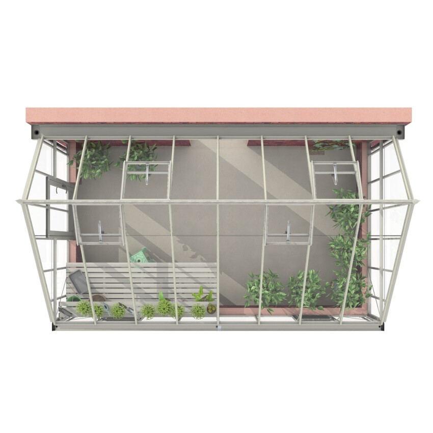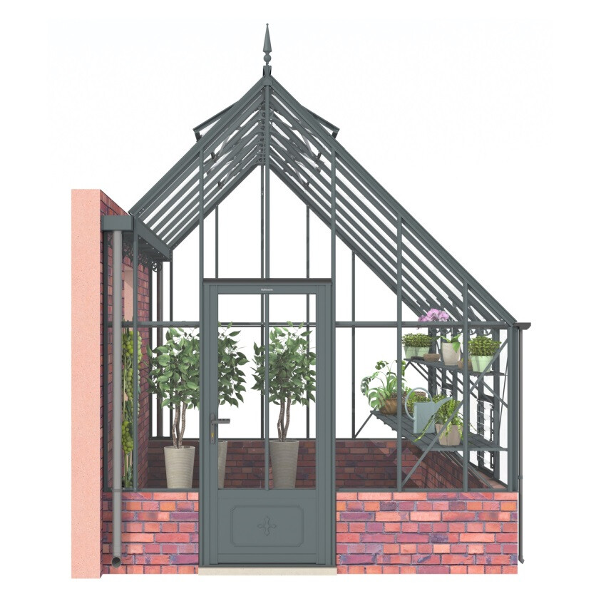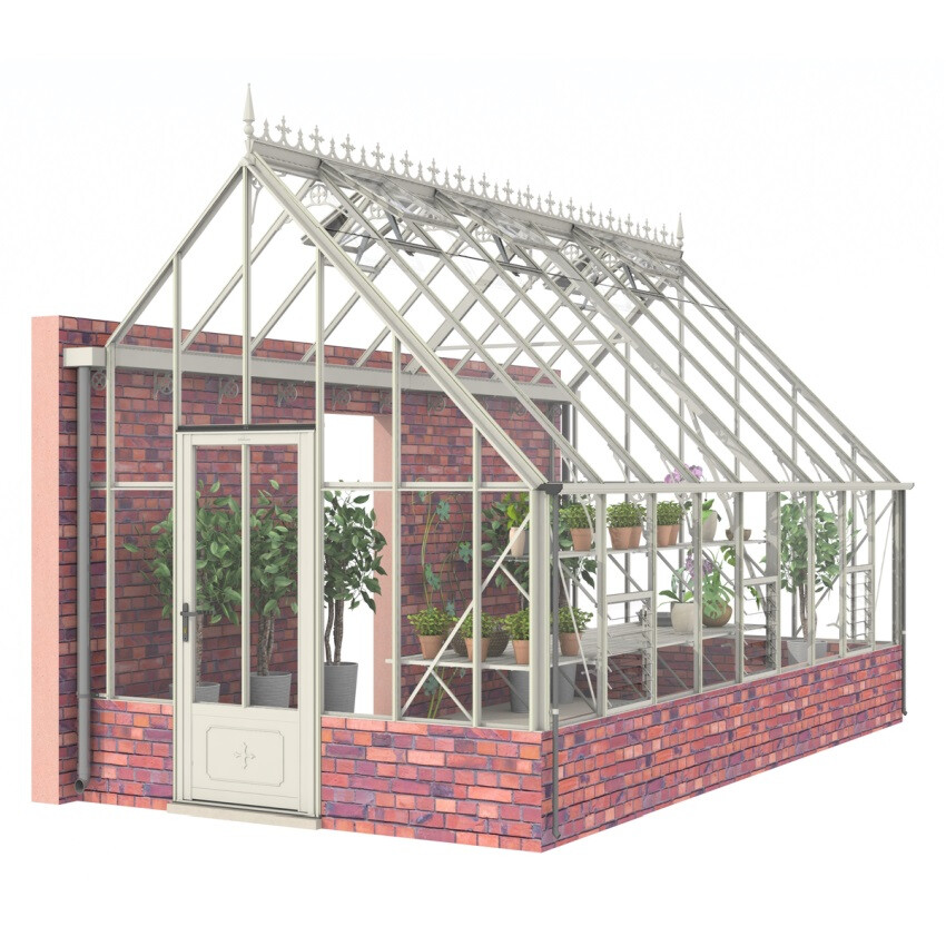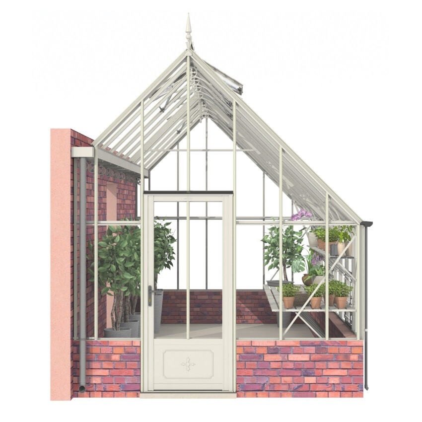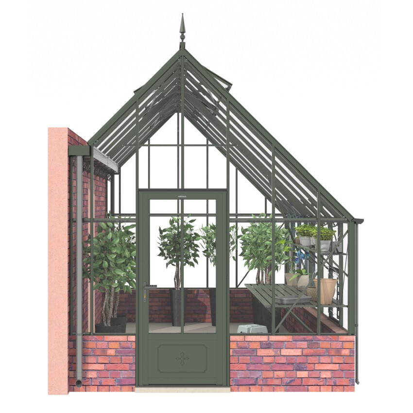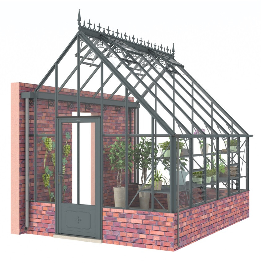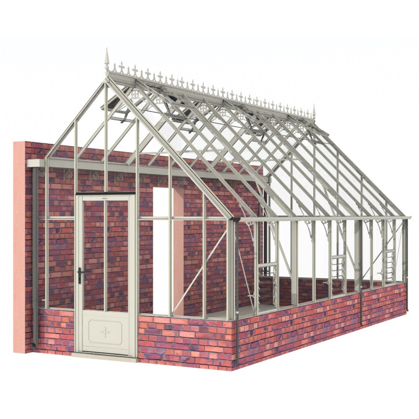 Die enorme Firsthöhe und die 45 Grad-Dachneigung sind typisch für den viktorianischen Stil. Dieses Modell ist in zwei Varianten verfügbar: mit Glas bis zum Boden oder in der sogenannten Dwarf Wall-Ausführung, geeignet für einen 52 cm hohen Backsteinsockel.