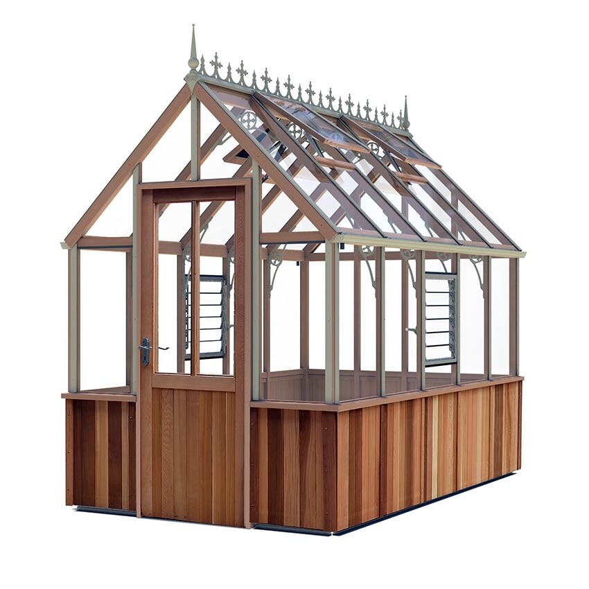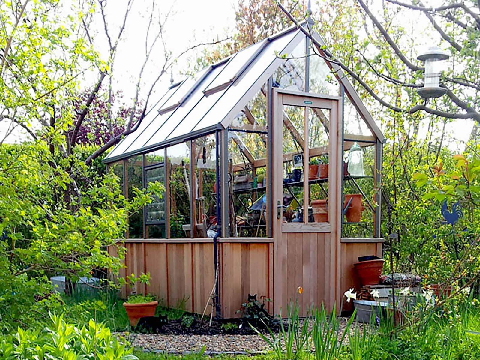 So werden die Vorteile von Zedernholz im Inneren mit den Vorteilen von noch wetterfesterem Aluminium an der Außenseite in einem Hybrid-Gewächshaus kombiniert.
