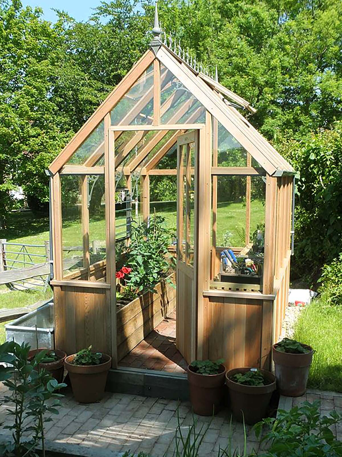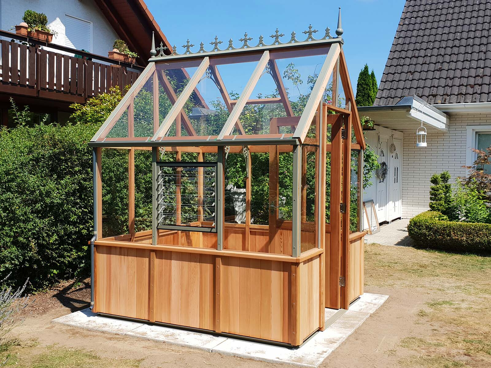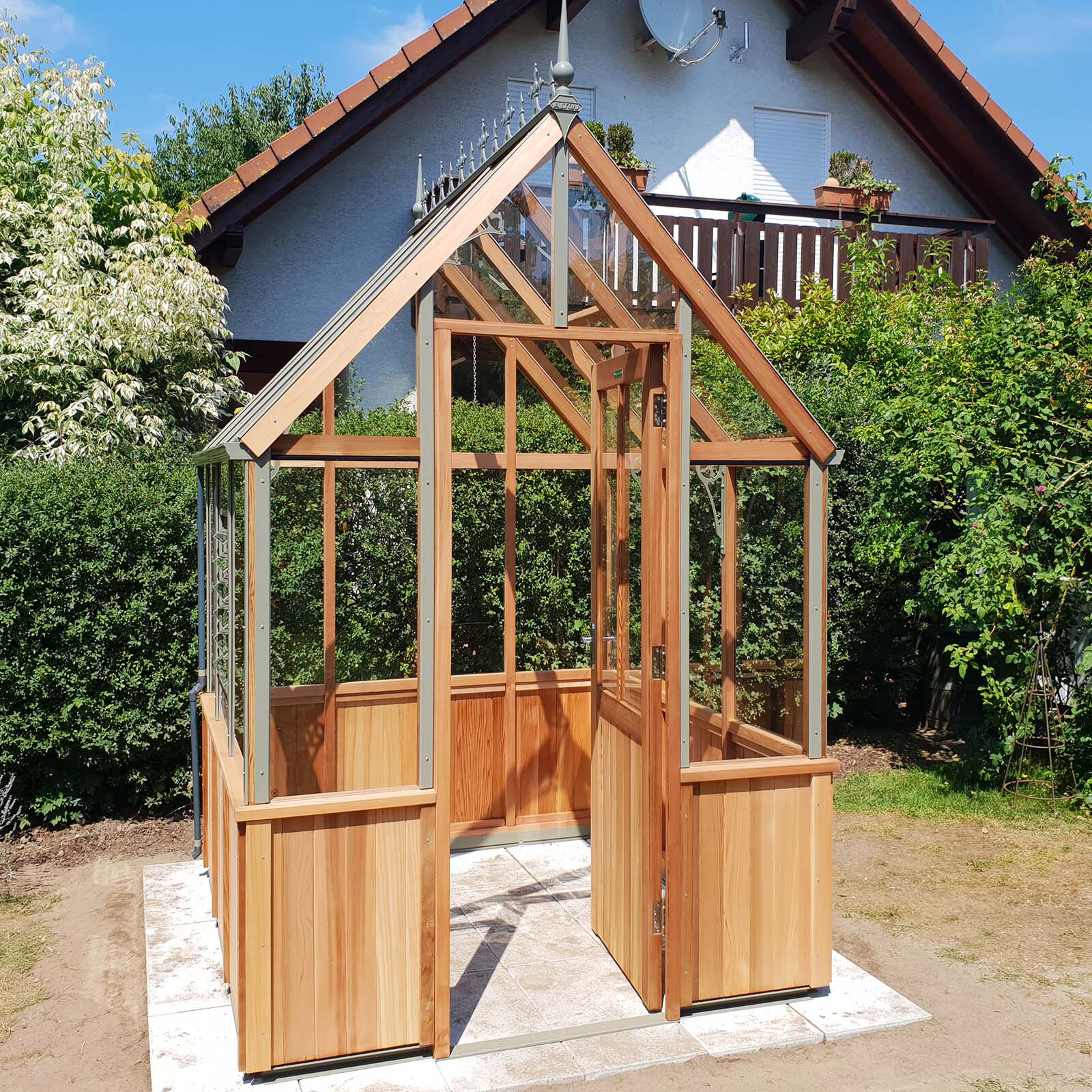 Das Gerüst ist aus hochwertigem und langlebigem Zedernholz gefertigt und durch innovative Holzverbindungen sehr stabil. So entsteht ein Gewächshaustyp, der nicht nur sehr ansehnlich ist, sondern auch besonders praktisch und nachhaltig konzipiert ist.