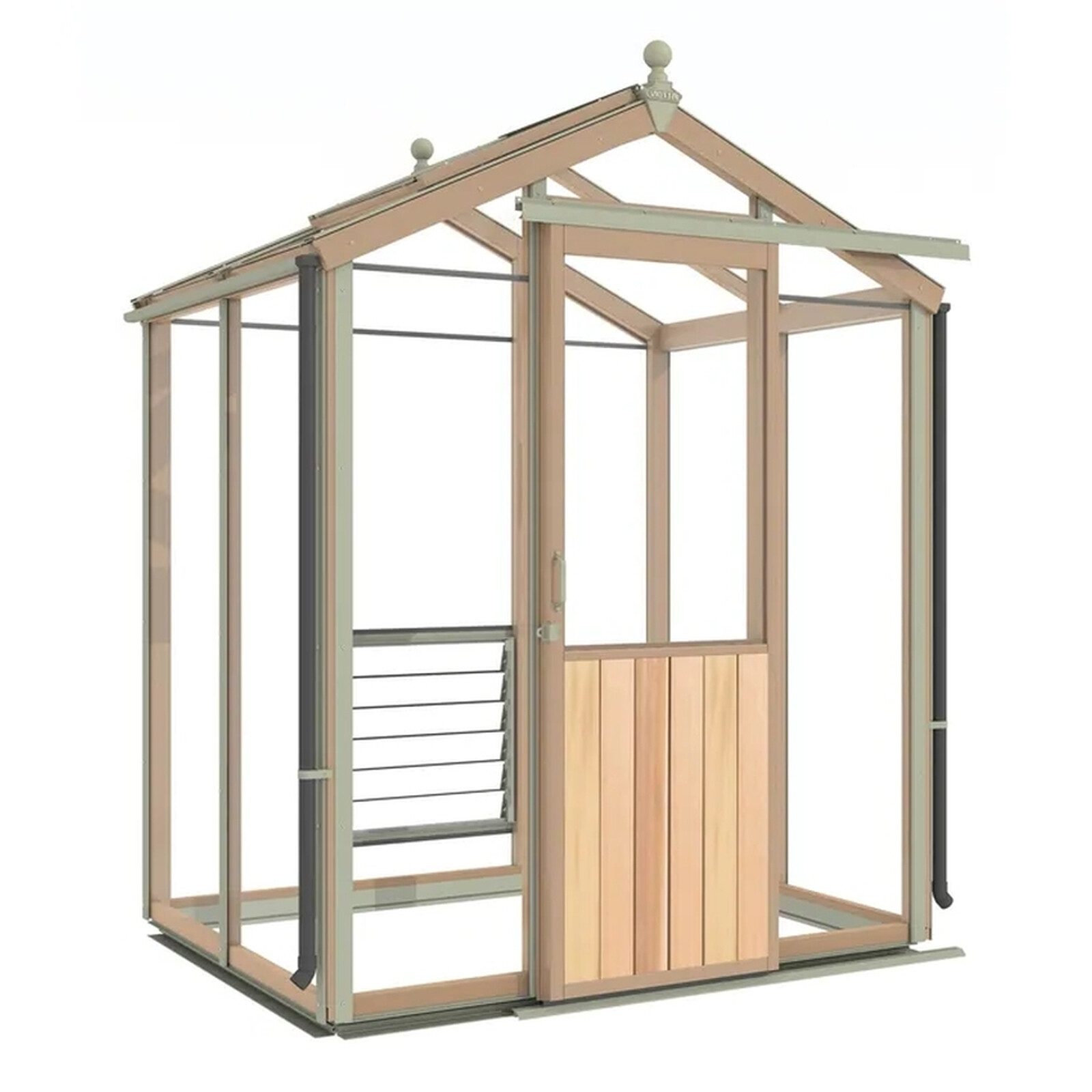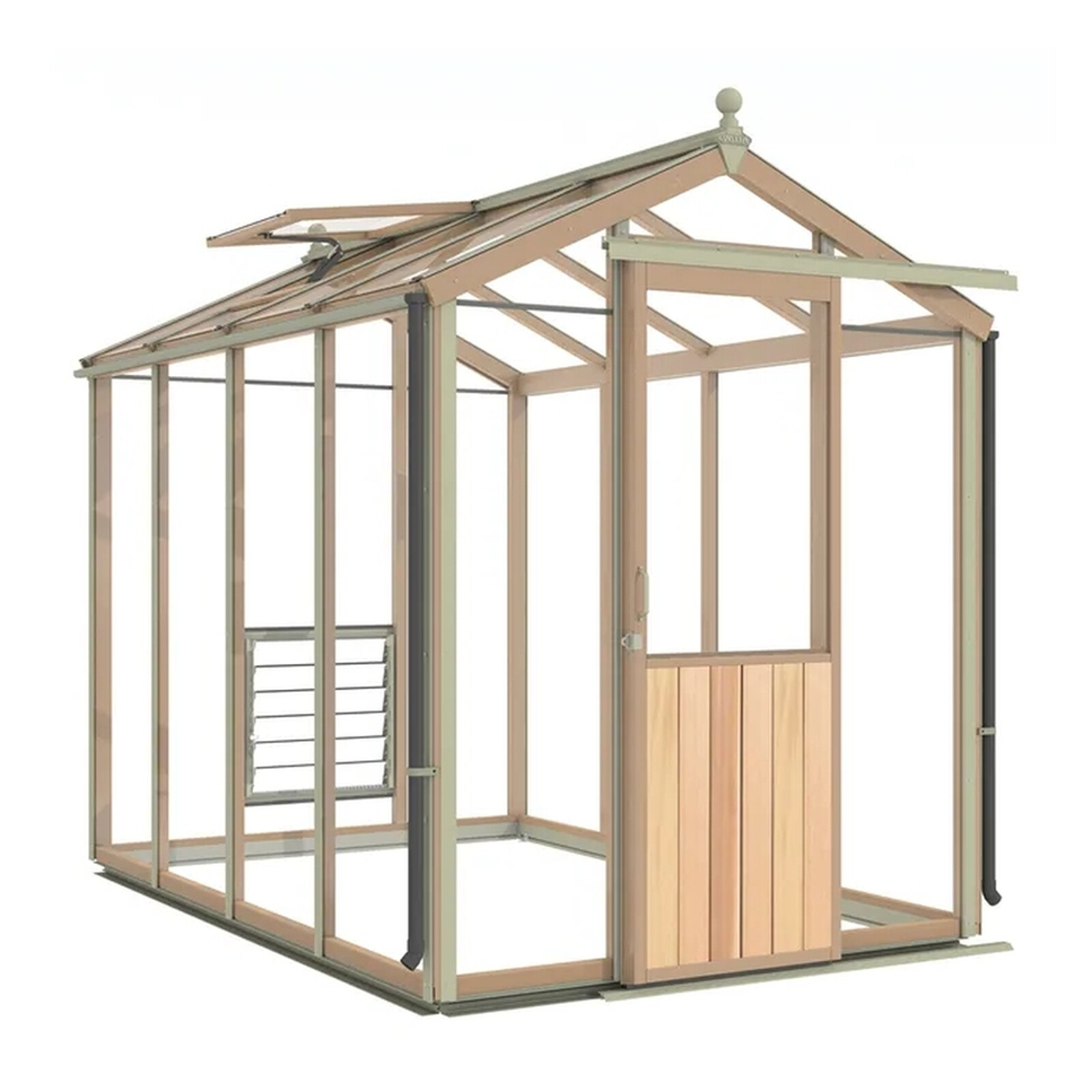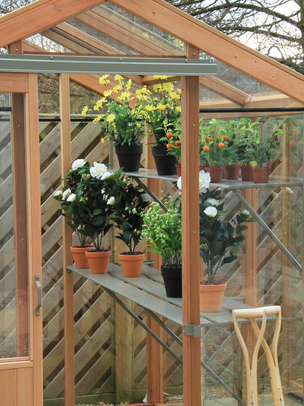 Das Gerüst dieses Gewächshauses ist aus hochwertigem und langlebigem Zedernholz gefertigt und durch innovative Holzverbindungen sehr stabil. So entsteht ein Gewächshaustyp, der nicht nur sehr ansehnlich, sondern auch besonders praktisch und nachhaltig konzipiert ist.
