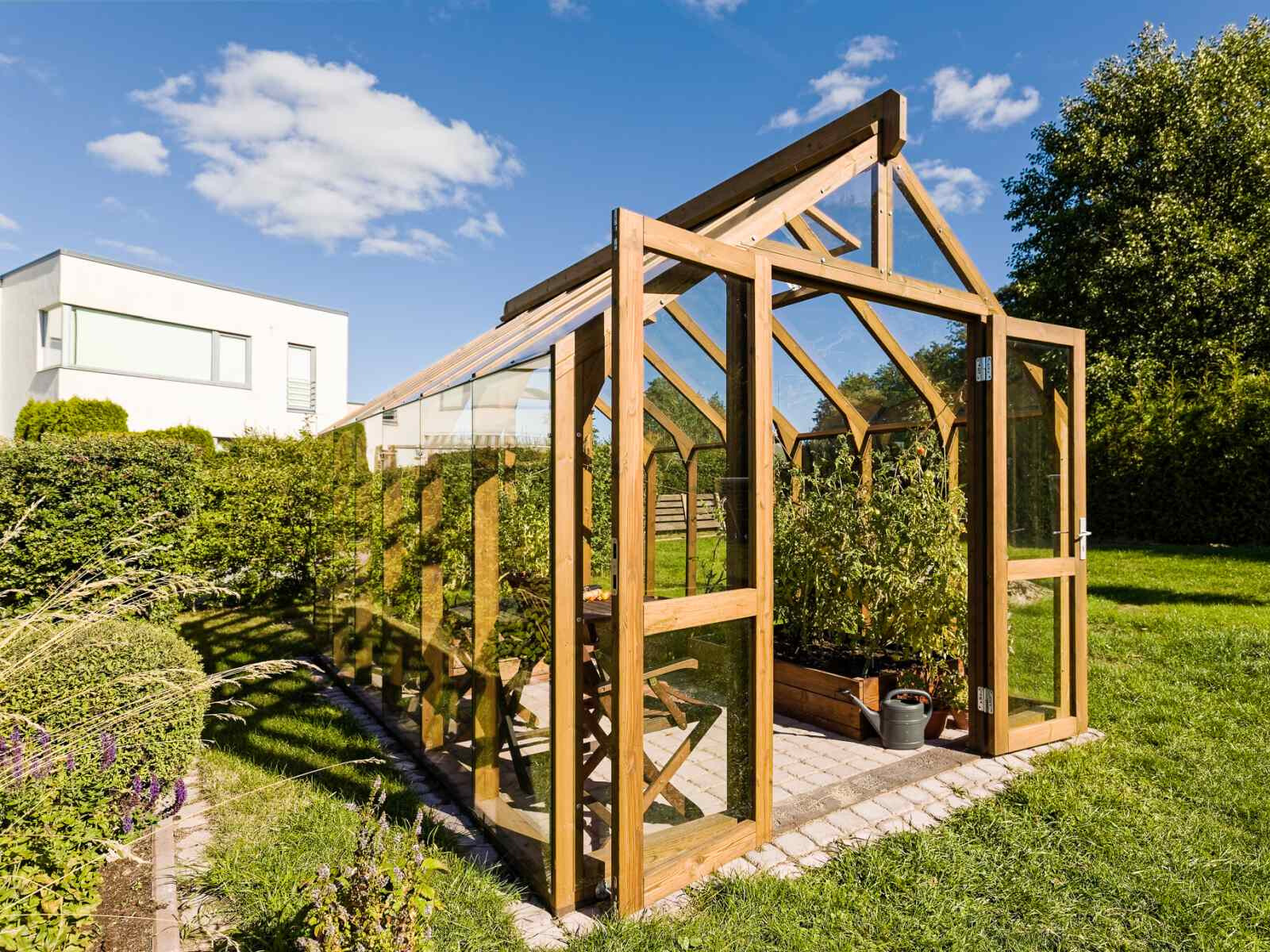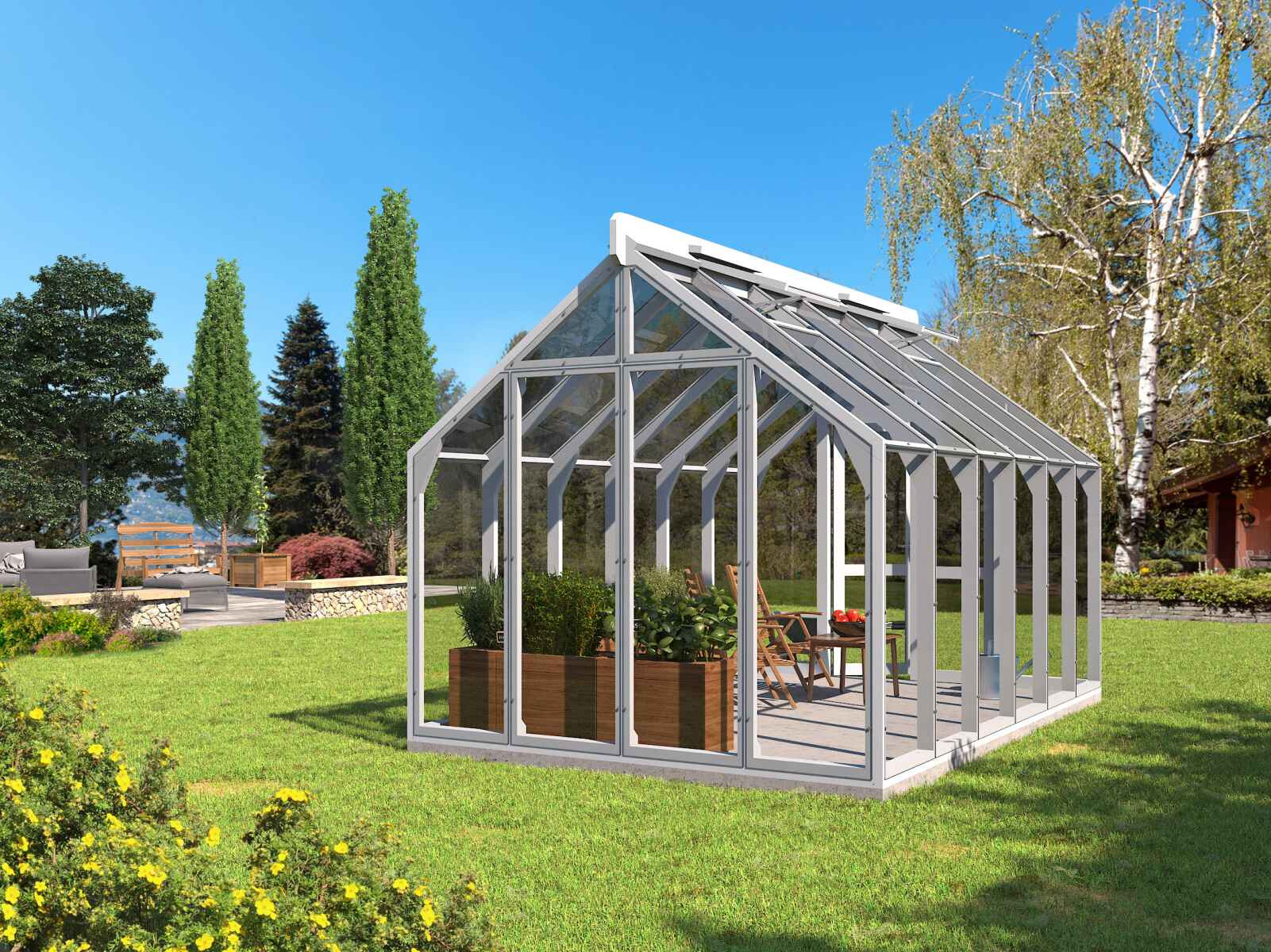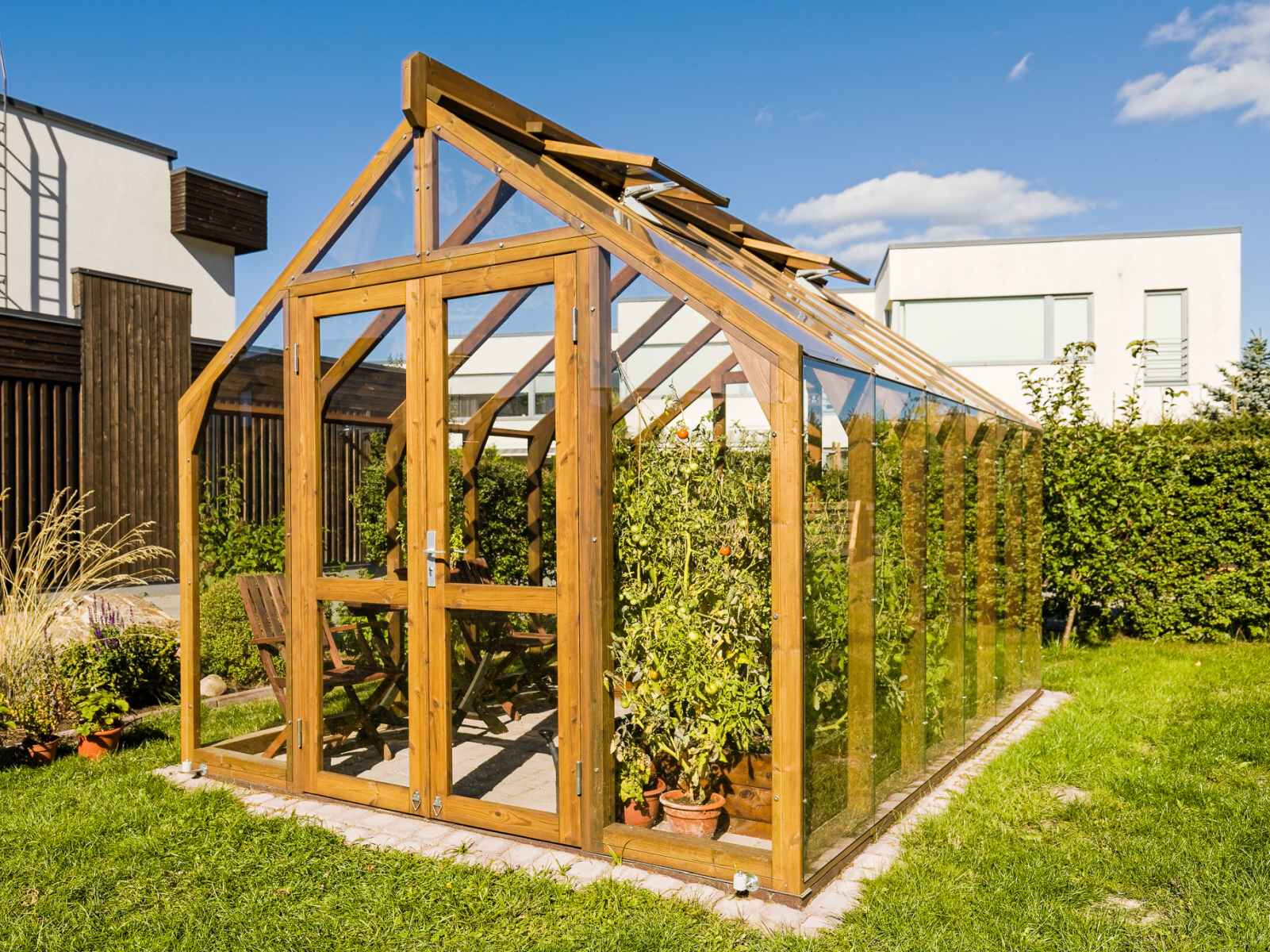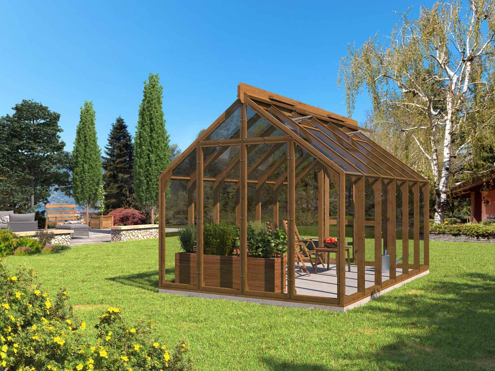 Elegantes und solides Gewächshaus aus dickem, wärmebehandeltem Holz.