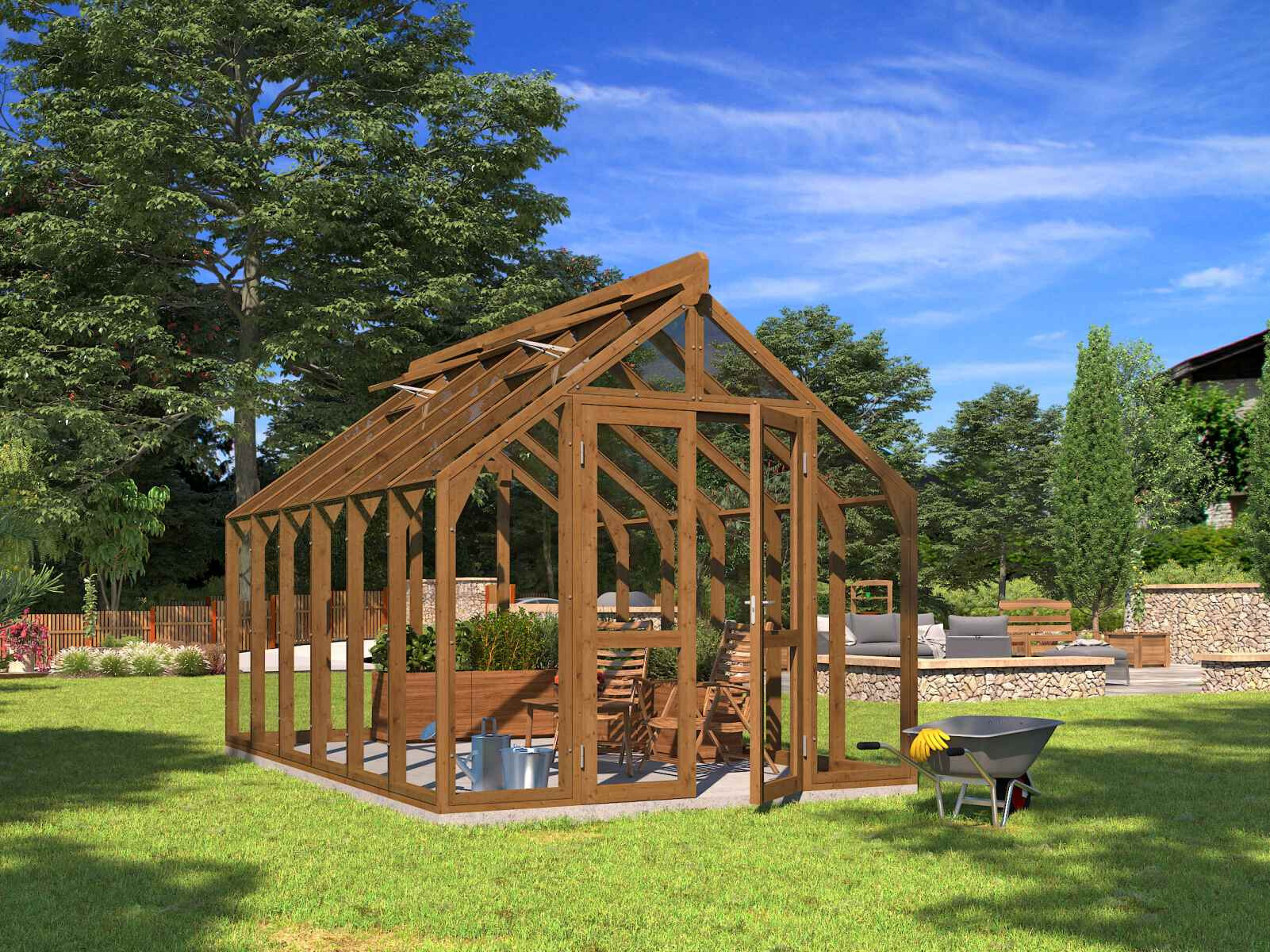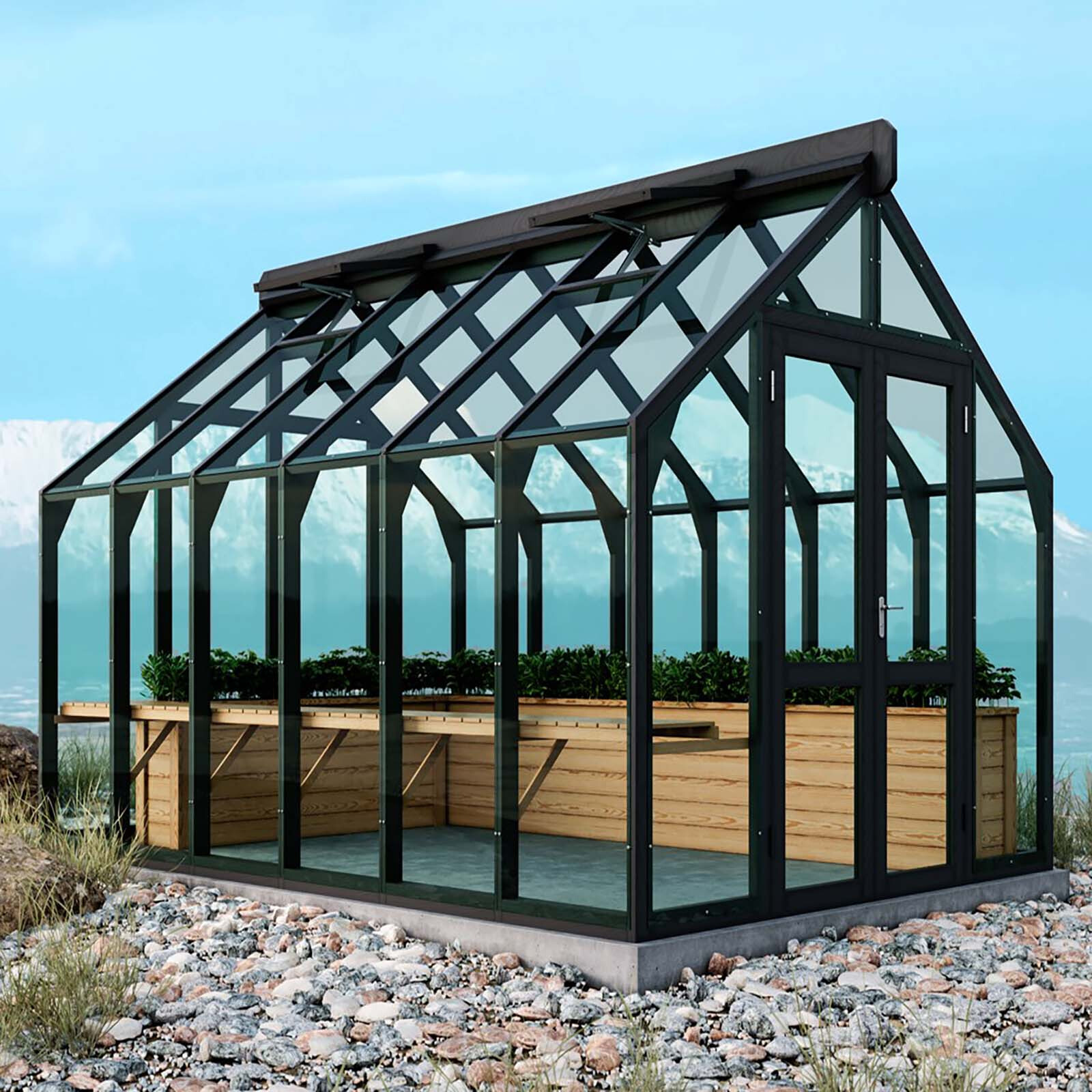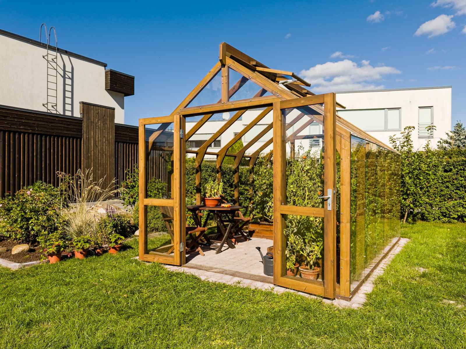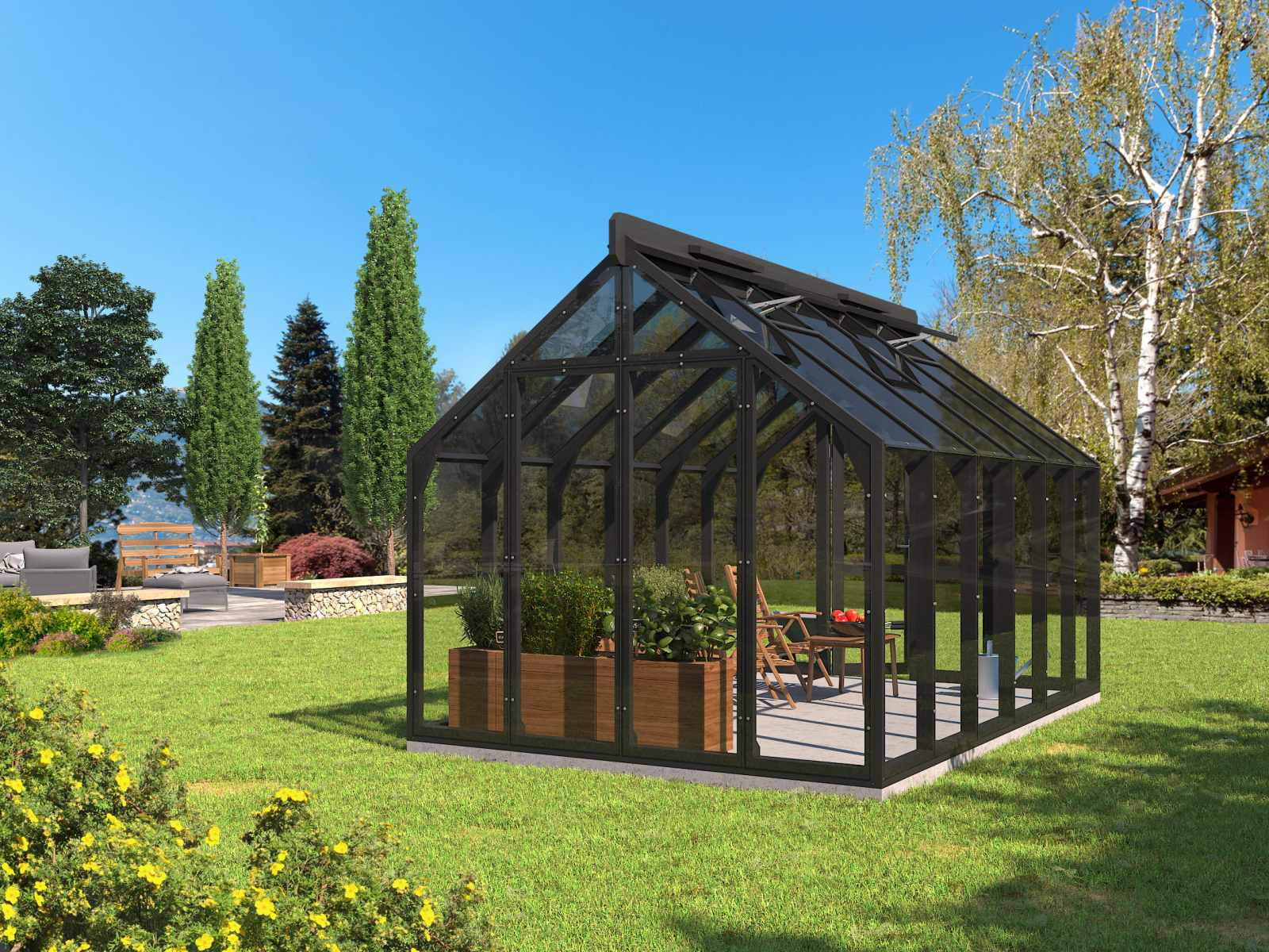 Elegantes und solides Gewächshaus aus dickem, wärmebehandeltem Holz.