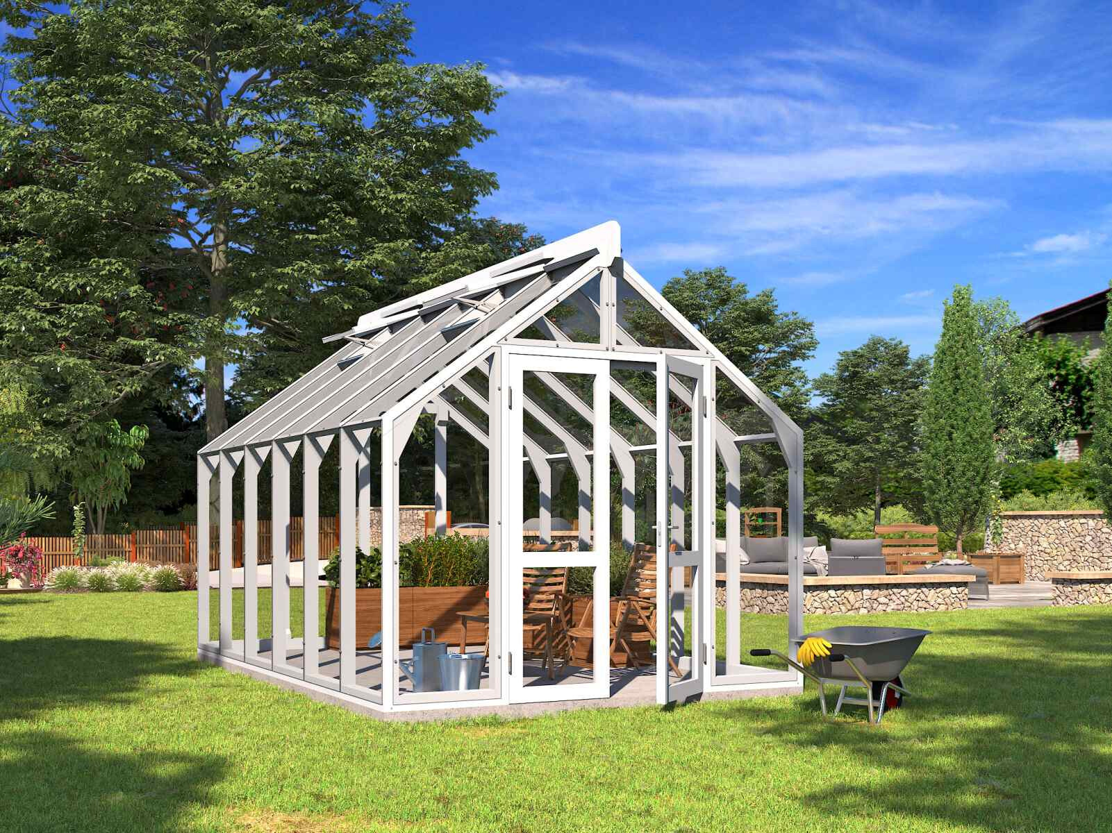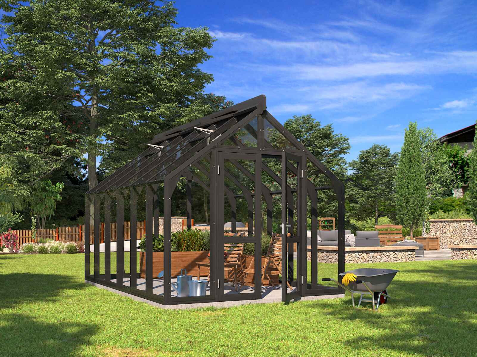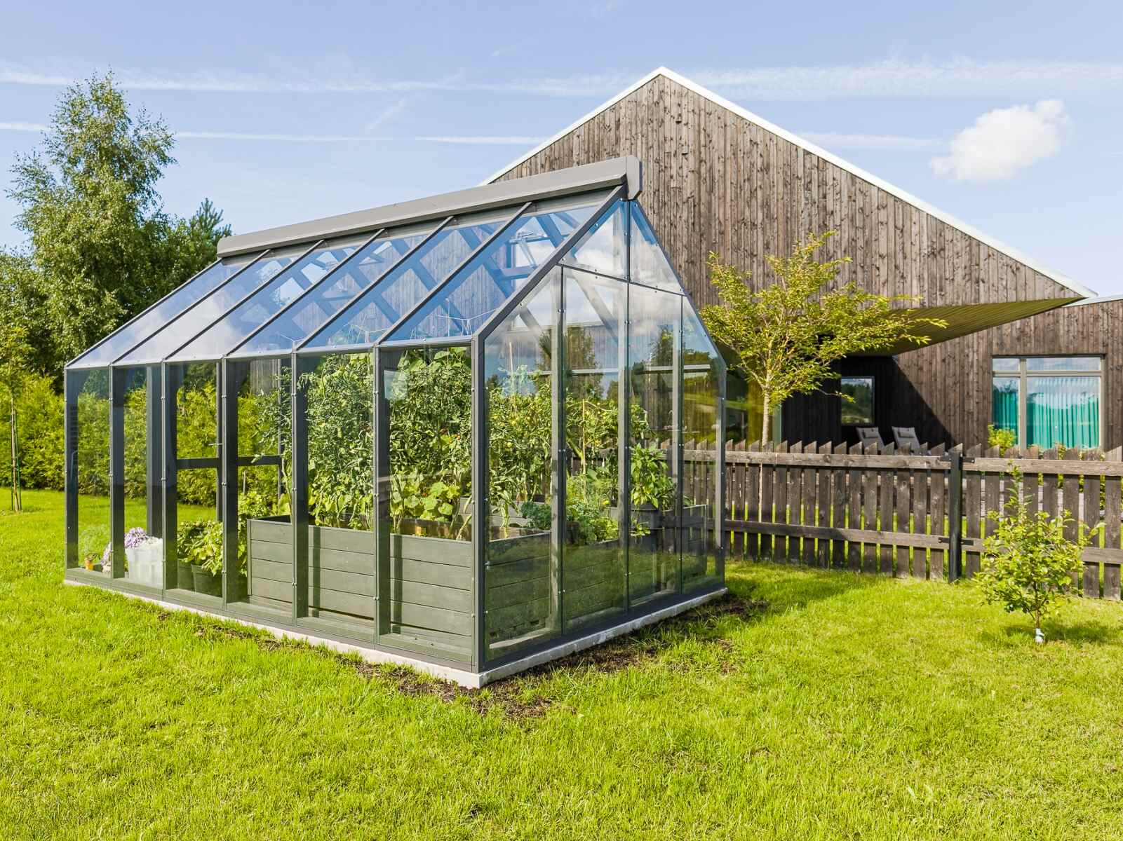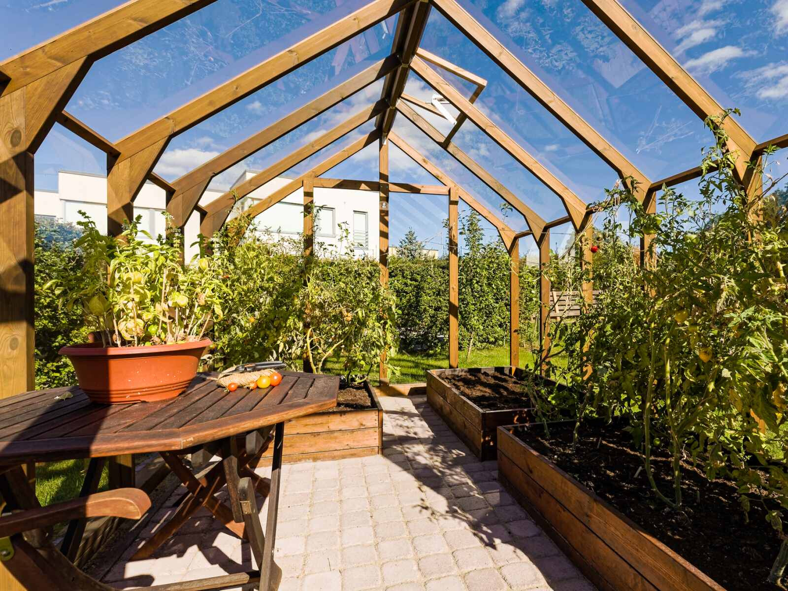 Elegantes und solides Gewächshaus aus dickem, wärmebehandeltem Holz.
