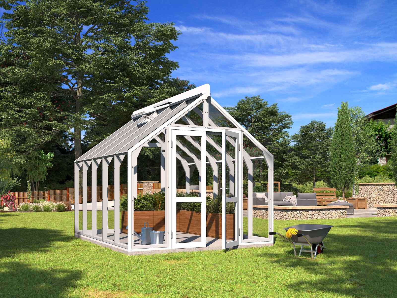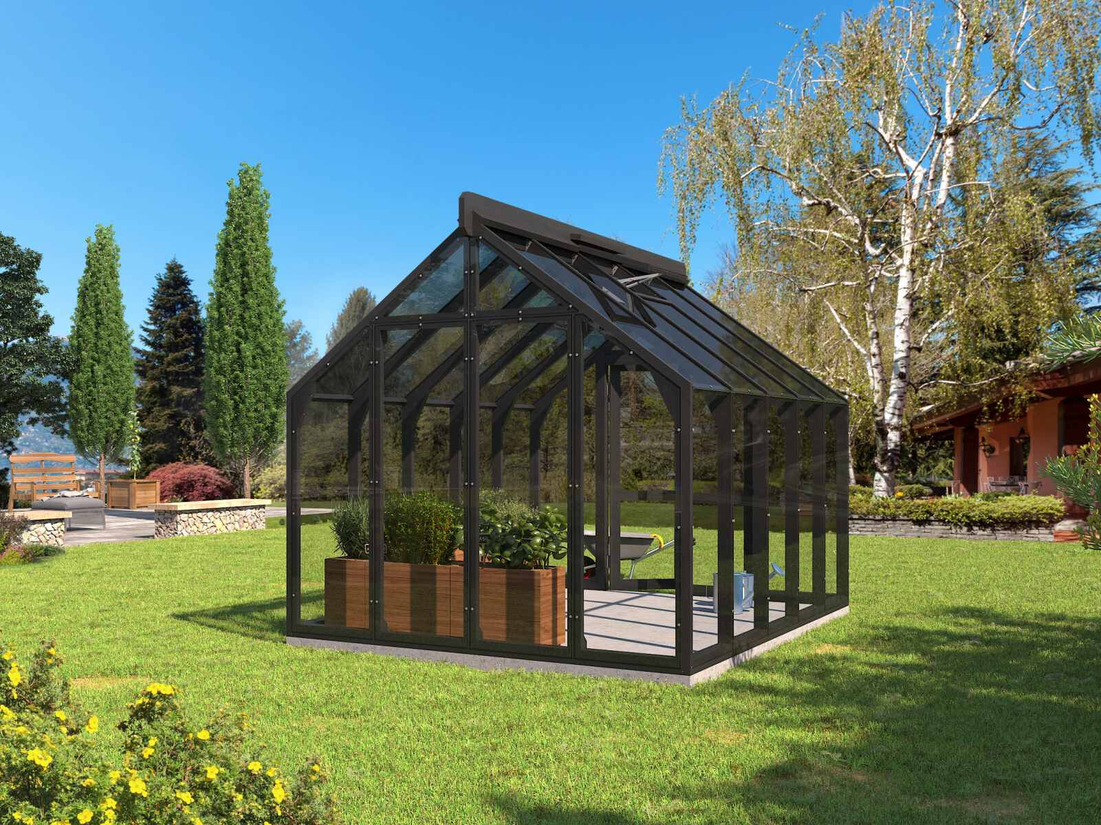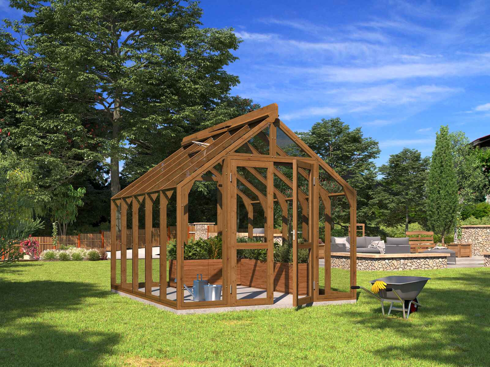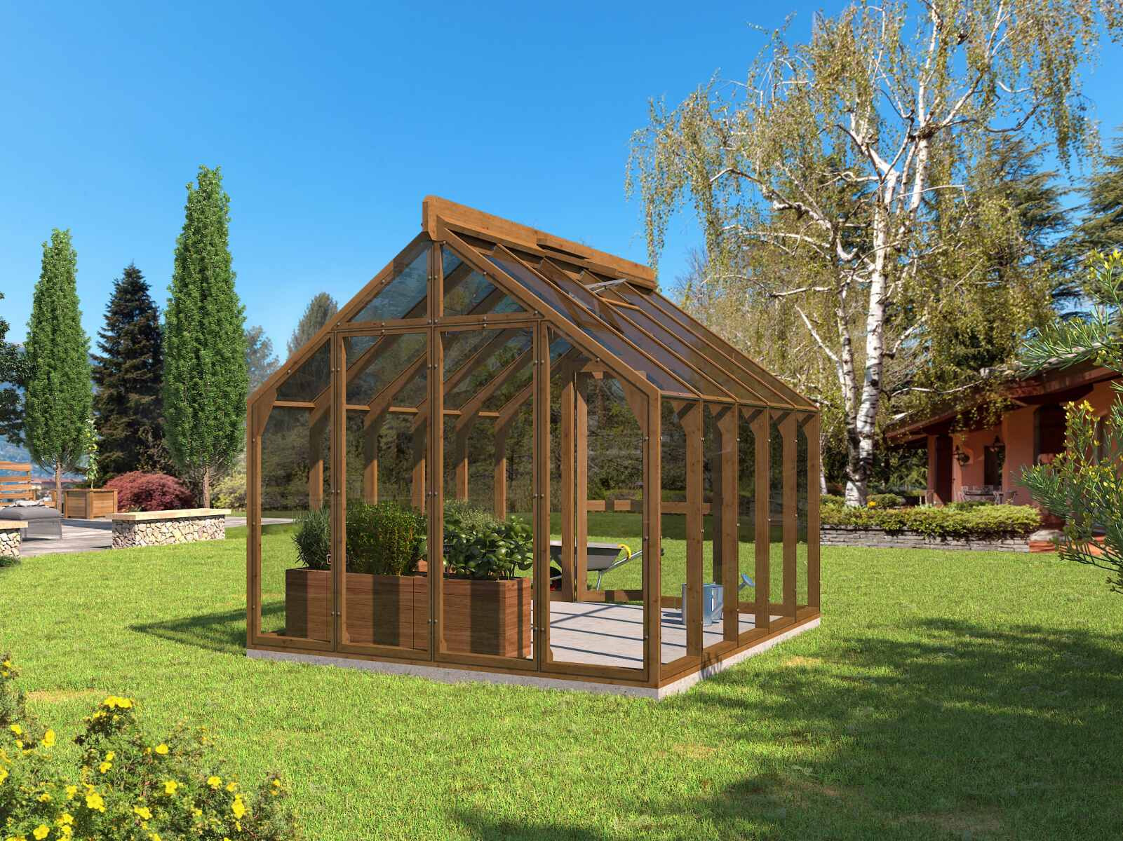 Elegantes und solides Gewächshaus aus dickem, wärmebehandeltem Holz.