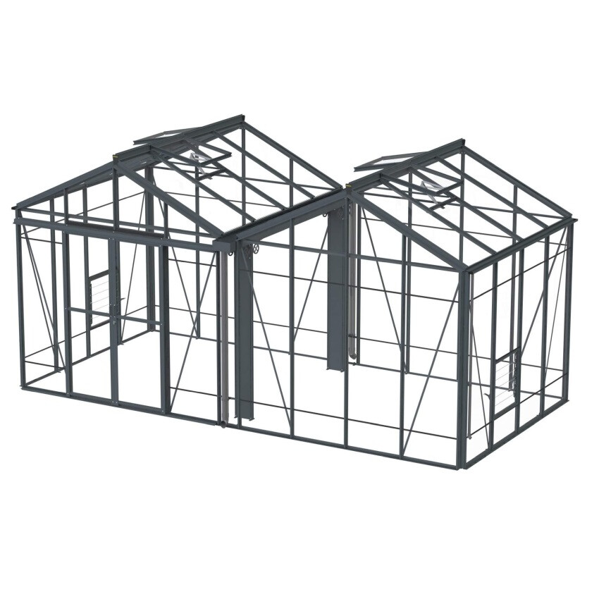 Dieses Modell mit zwei Firsten hat eine extra hohe Traufe von 197 cm. Dadurch können Sie die Doppeltür am Ende oder an der Seite positionieren. Außerdem ist die Kehlrinne hoch genug, um darunter entlangzulaufen, sodass ein großes, praktisches Gewächshaus mit einem offenen Raum entsteht.