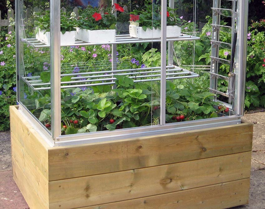 Das Mini-Gewächshaus Harlow 3 ist konzipiert als Anlehngewächshaus, kann aber auch mit einer Rückwand aus Glas zu einem freistehenden Modell umgerüstet werden. Nach Wunsch ist ein Hochbeet-Unterbau aus unbehandeltem Lärchenholz verfügbar. Die Regale lassen sich bei Nichtgebrauch einfach zusammenklappen.