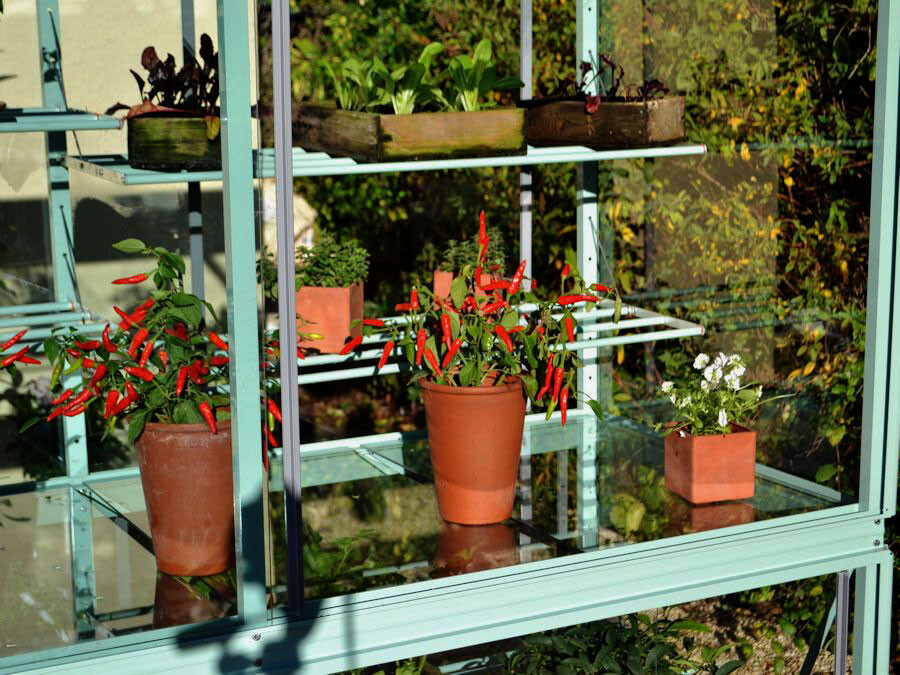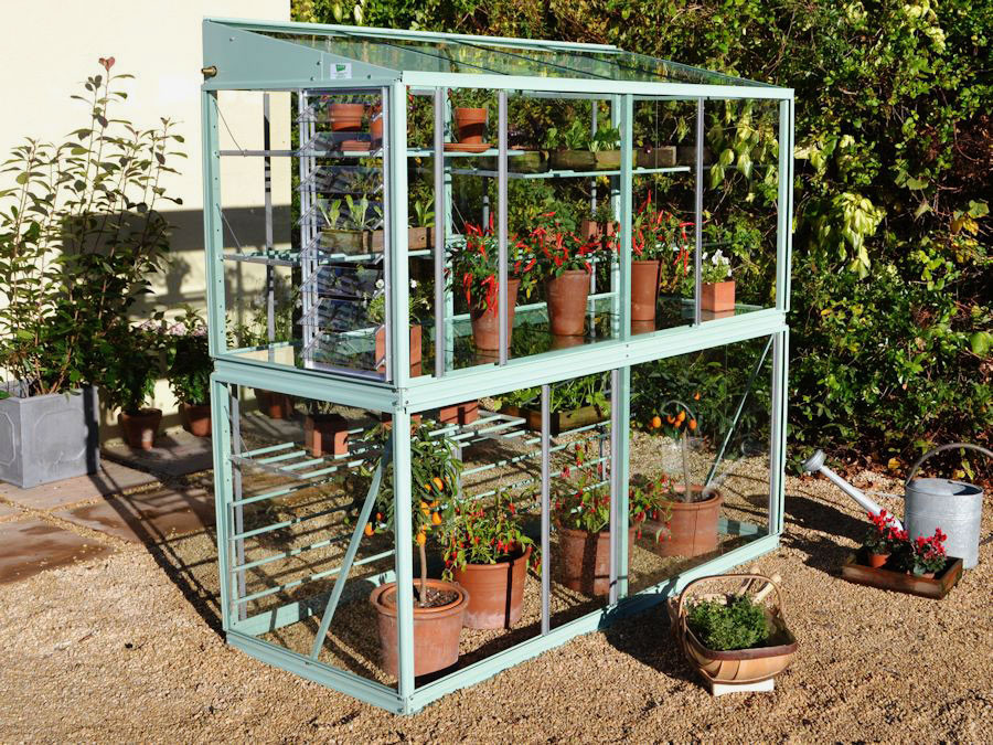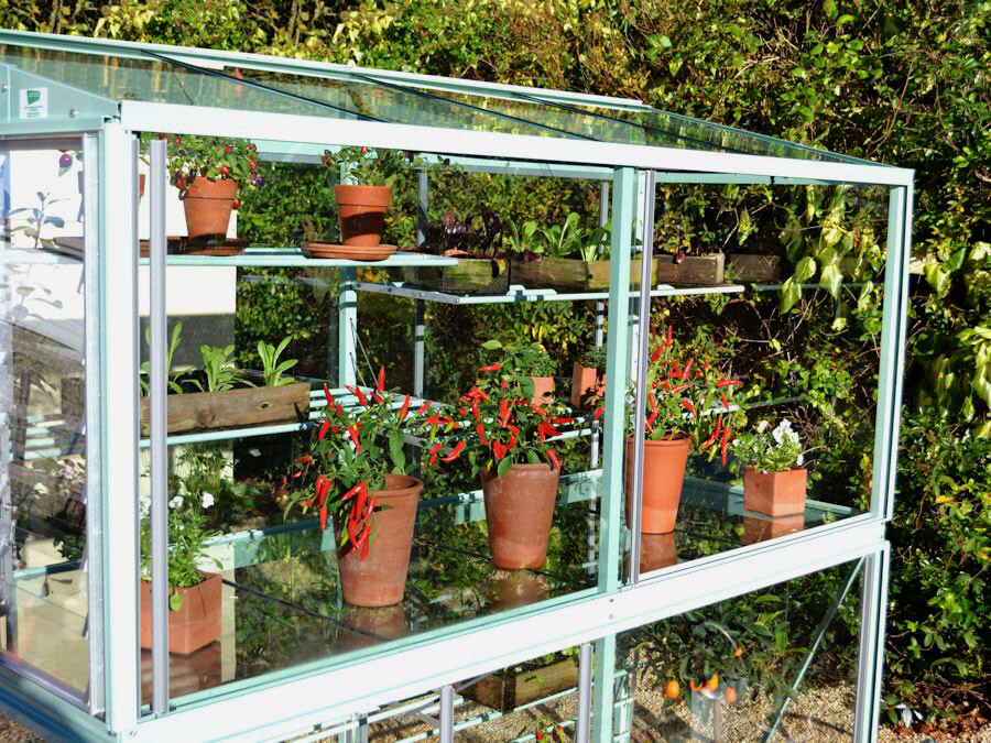 Das Mini-Gewächshaus Exbury 6 ist mit 79 cm extra tief und verfügt über einer Rückwand mit Fensterscheiben. Somit hat dieses Modell sowohl vorne als hinten Schiebetüren für einfachen Zugang und Lüftung.