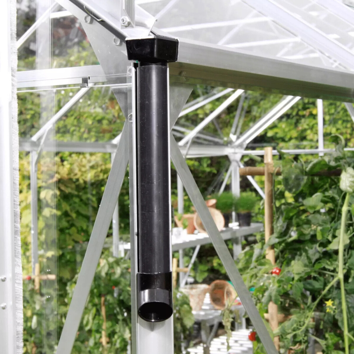 Mit einer Regenrinne und diesem praktischen Regenrohr-Set können Sie ganz einfach Regenwasser auffangen, das vom Dach Ihres Gewächshauses abläuft. Ideal, um Ihre Pflanzen umweltfreundlich mit aufgefangenem Wasser aus der Regentonne zu bewässern. Gleichzeitig verhindern Sie, dass Wasser über die Verglasung läuft und unschöne grüne Ablagerungen hinterlässt.