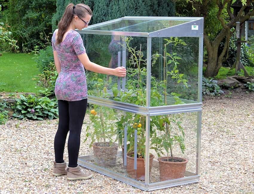 Das Access Tomatenhaus ist ideal für die Tomatenanzucht in Töpfen. Für extra Stabiliät und Sicherheit ist dieses Tomatenhaus mit 3 mm Sicherheitsglas (ESG) versehen. Nach Wunsch können Sie Ihr Tomatenhaus auf 4 mm ESG aufrüsten. 4 mm ESG gilt als fast 'unzerbrechlich' und ist von uns gegen jeglichen Hagelschäden garantiert. Die vorderen Schiebetüren und die Dachplatten lassen sich für eine perfekte Belüftung öffnen und leicht entfernen.